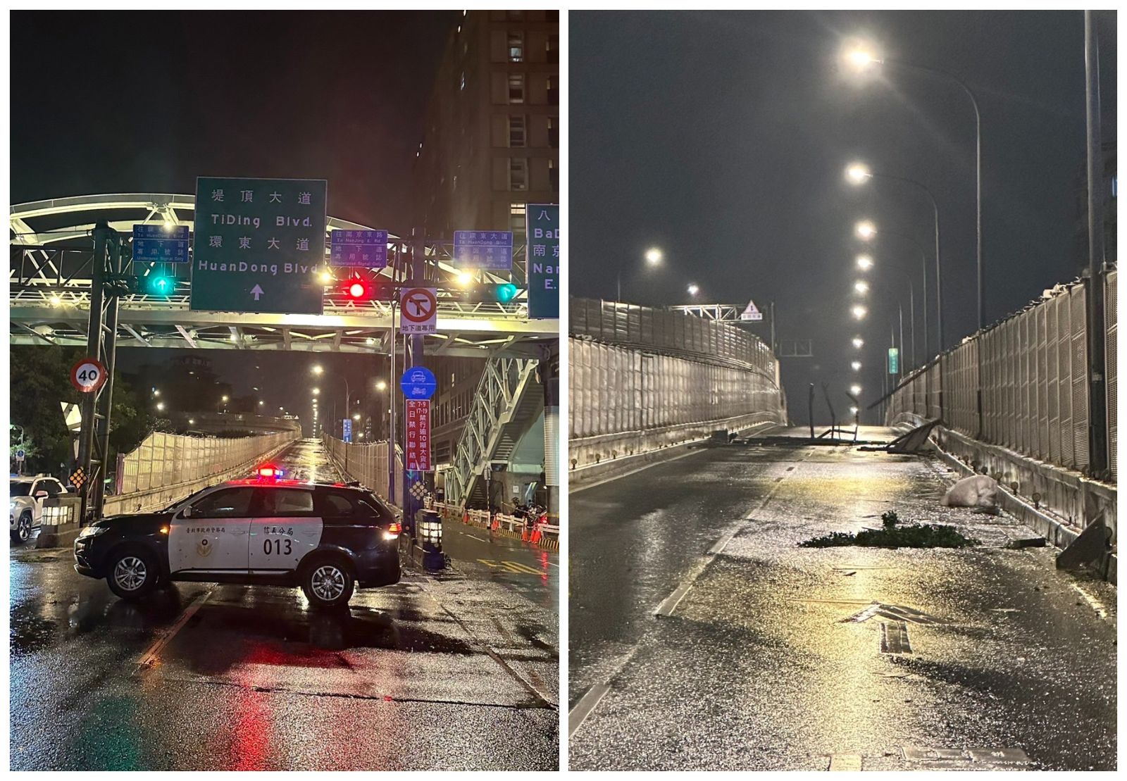 警方到場管制,基隆路上環東匝道也暫時封閉。(左圖,翻攝畫面)環東匝道2車道佈滿了被強風吹落的遮陽棚架。(右圖,翻攝畫面)發布時間:2024.10.31 22:55 臺北時間
