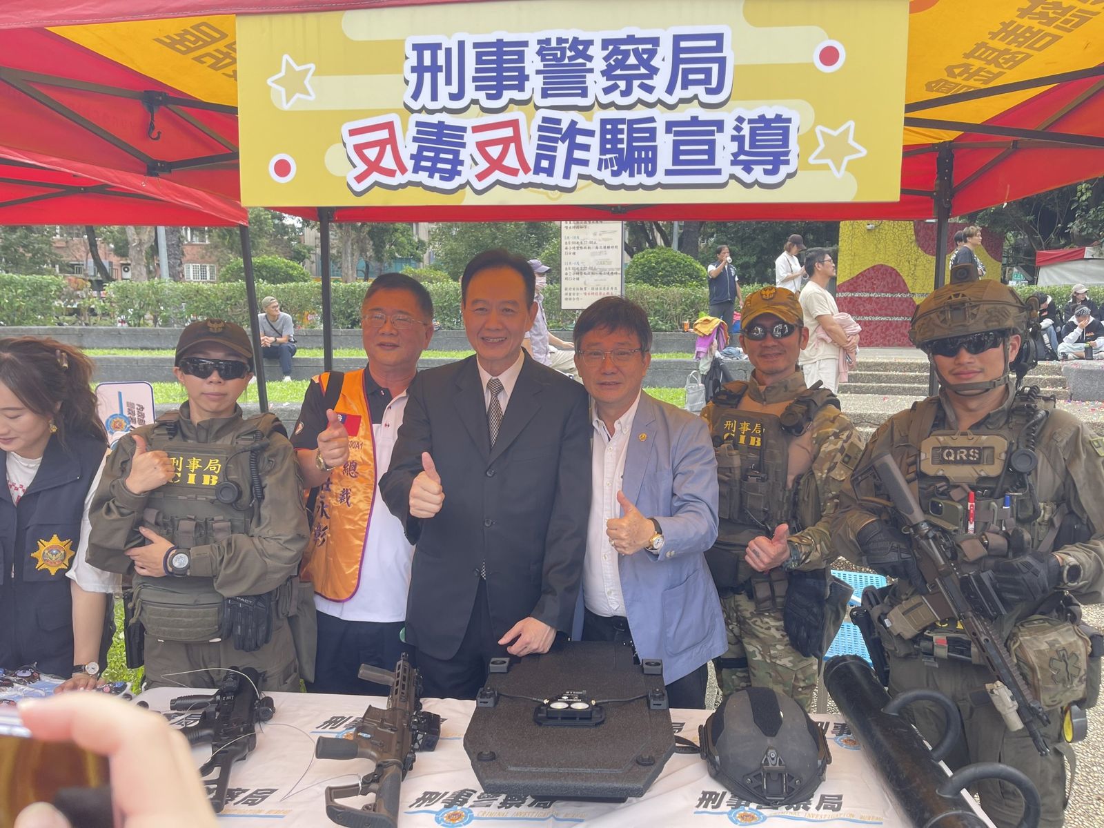 除了反詐、反毒設攤互動,更受矚目的是刑事局全副武裝的除暴特勤隊隊員,現場擺設難得一見的槍枝、頭套及其他專業裝備,讓民眾能夠近距離了解除暴特勤隊的專業。