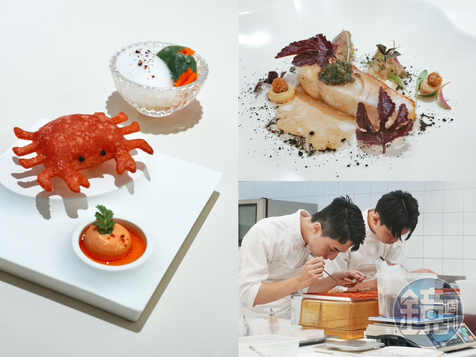 以瑞士國菜「起司鍋」為發想的「烏魚子乳酪燴鳥貝」帶入台式風味,以燉煮的青蒜、菊芋鋪底,放上酸豆奶油燴的珍貴鳥貝與鮮甜干貝,最上層是口感輕盈綿密的馬鈴薯泡,與厚度精細拿捏過的新竹野生烏魚子片一同入口,絲毫沒有違和感,魚卵香氣和諧了飽滿的奶香;「Caviar Aubergine」精選俗名「長尾鳥」的「絲尾紅鑽魚」,魚皮相當薄,考驗廚師的炙烤功夫;主廚以鷹嘴豆泥、炙烤茄子泥、大黃瓜沙拉為配菜,最後撒上黑橄欖粉,整道菜飽含不同食材經由各異火候帶出的豐富香氣。