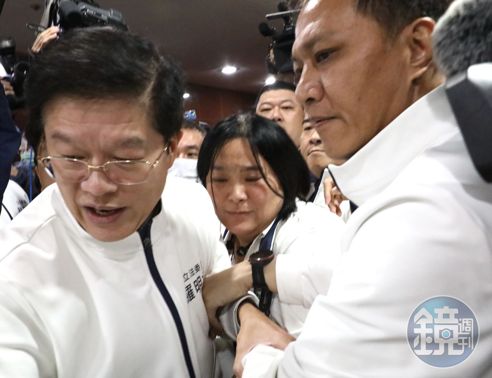 陳玉珍宣布散會後,被擠得無法離開,藍綠又一陣推擠,陳玉珍還一度被民進黨立委賴惠員、王美惠等人壓到桌上。而民進黨立委郭國文也因不滿國民黨立委霸占主席台,衝進人牆怒扯國民黨立委張智倫的衣領。