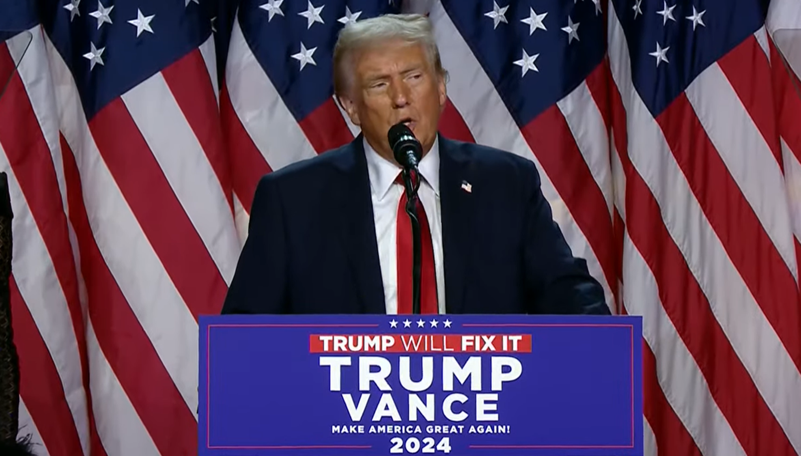 川普演說稱,他要幫助受傷的美國「治癒」,並再度呼喊他的口號「要再次讓美國偉大」。川普也感謝所有支持者,以及看到共和黨在議會拿下控制權,讓他甚感欣慰。川普還說,他的勝選對美國人來說是「巨大勝利」,也將是美國的「黃金年代」。