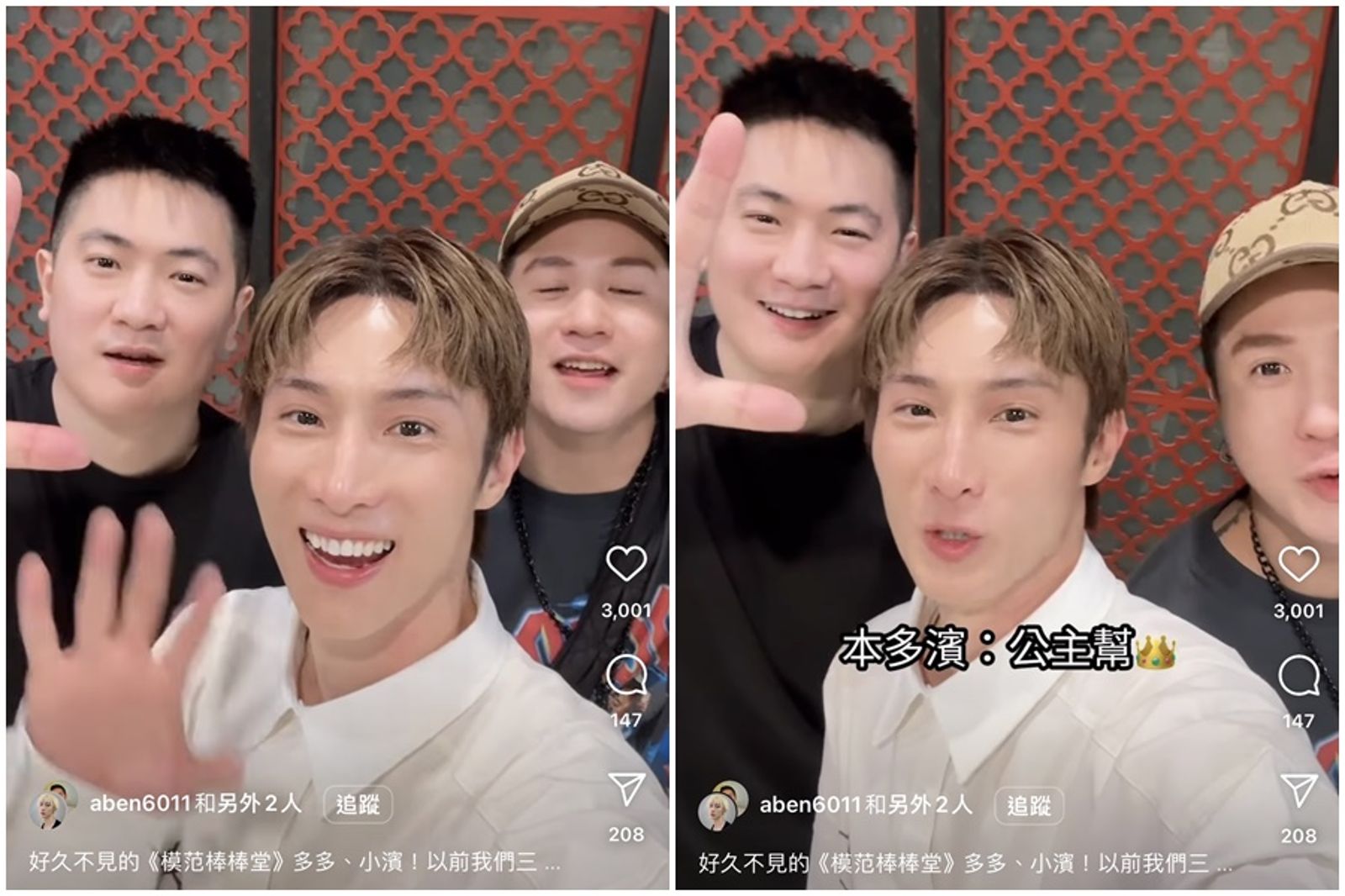 初代公主幫合體的畫面,引網友紛紛留言「初代公主幫耶,我的青春裡住的人」「記得阿本為他們兩個流過很多眼淚」,也有人說「只有阿本沒變」,結果釣出小濱、多多兩人親回:「什麼意思?」相當逗趣。