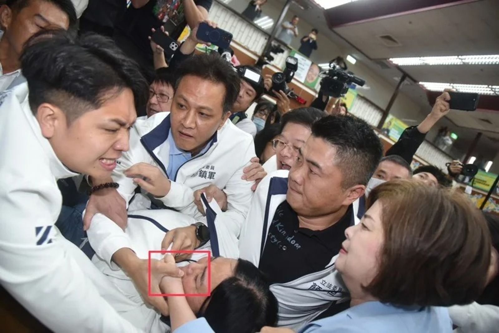 賴惠員(藍衣者)昨日衝鋒陷陣,與多名立委發生肢體推擠。而今日立委徐巧芯則公布一張照片,可見藍綠委互相推擠,陳玉珍卡在中間,其中綠委賴惠員的手被另一名藍委邱鎮軍抓住,並剛好就在陳玉珍臉旁邊,因此徐巧芯直指賴惠員就是害陳玉珍「斷牙」的凶手。