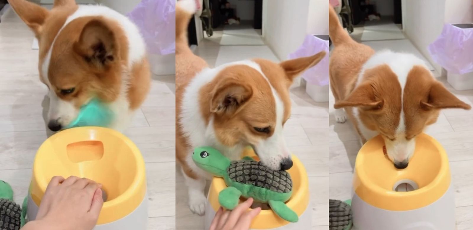 台中一隻6歲的柯基「呆寶」因對心愛的烏龜玩偶情有獨鍾,鬧出令人捧腹的呆萌舉動。這天,呆寶興致勃勃地想玩自動發射球球的遊戲,玩具球被拋出後,牠卻轉身叼回來了自己最寶貝的烏龜玩偶,接著把玩偶塞進發球機裡。
