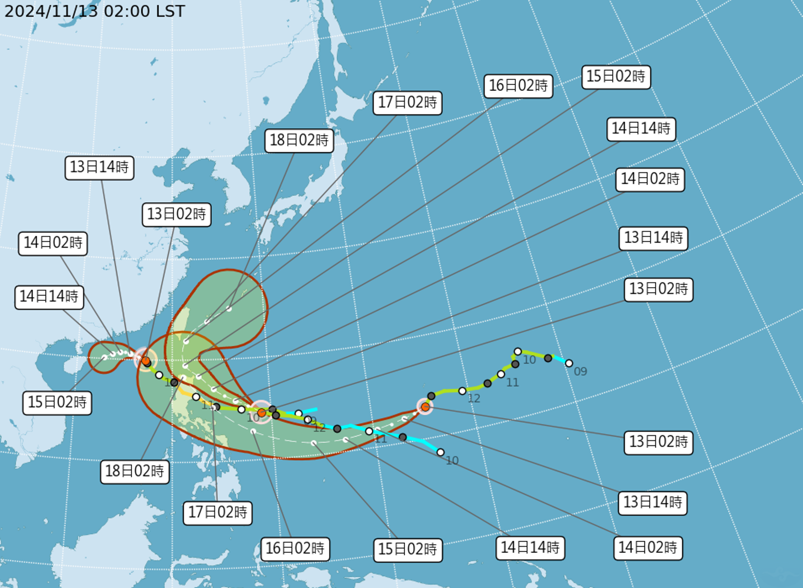 另外,第24號輕度颱風「萬宜」目前位於關島附近海面,正向西南西方向移動。氣象局評估,萬宜對台灣本週天氣暫無影響,後續動向仍需觀察。第23號輕度颱風「桔梗」目前位於東沙島海面,正朝廣東及海南島海面進行,強度逐漸減弱,對台灣影響有限。