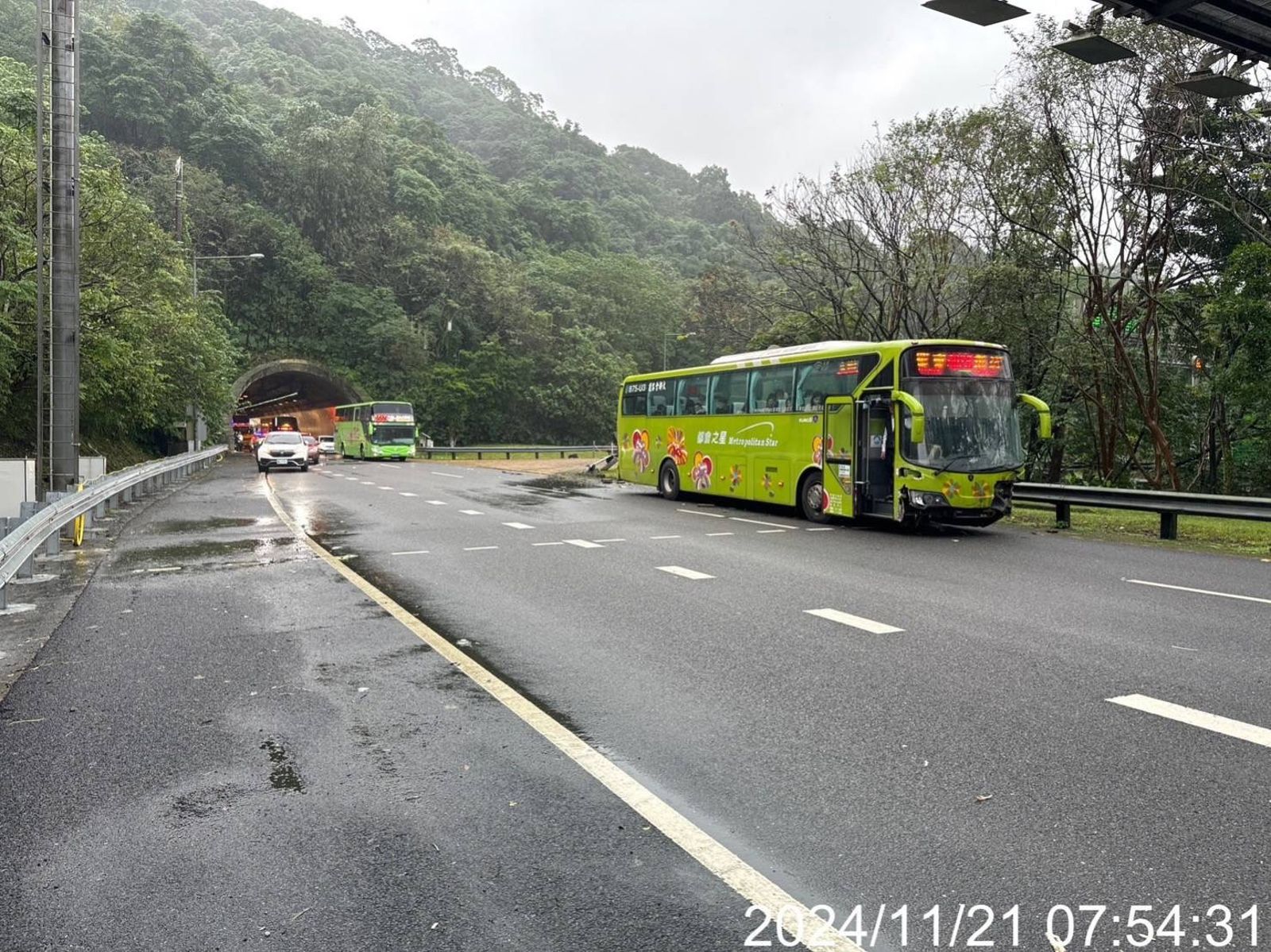 一輛大都會客運今天(21日)早上7點多行經國道5號北上0.2公里南港路段時,疑因未保持安全距離,追撞前方3輛轎車,客運肇事後,車身卡進護欄裡,占用內側車道,4車追撞意外導致今早上班尖峰時間車流回堵,南港段更是紫爆長達3小時,該起事故中所幸僅有一人輕傷,送醫無礙。