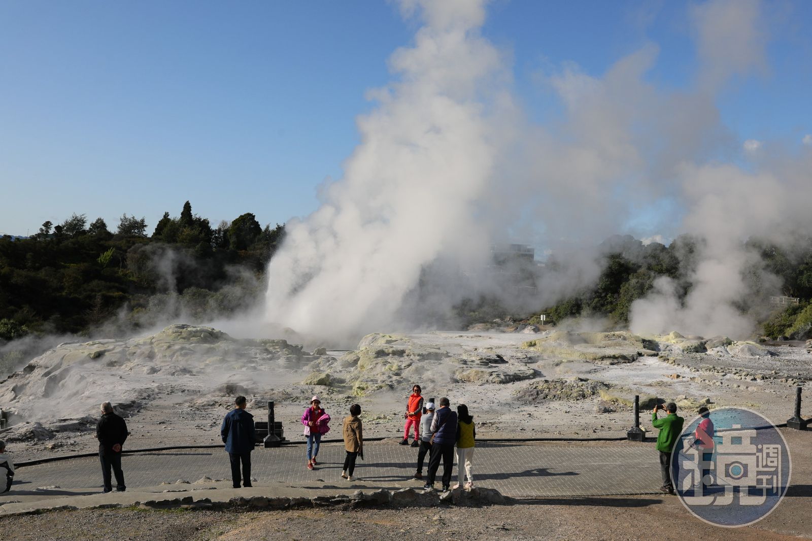 古老的毛利村「Te Puia」,雖然造訪的亞洲觀光客不多,但部落裡的地熱間歇泉、原始地貌、部落族人精湛的木雕、石雕、骨雕及編織技藝,都相當值得一看。一進門可見到毛利文化重要的公共建築「Wharenui」,木頭結構上方以精美的雕刻述說古老神話和傳說,是他們集會、祭典儀式和社交場域,還有儲存食物的矮房「Pataka」,同樣有細緻的木雕裝飾。