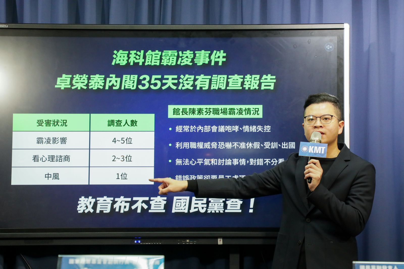 「教育部的嘴臉,簡直是比勞動部還要惡劣」,康晉瑜表示,35天過去,一個調查報告都沒有,要問教育部部長鄭英耀的心裡是否覺得真理正義是可以用拖、用瞞、用騙的?也請問是不是受到了什麼樣壓力,導致明明承諾一個禮拜內要交調查報告至今交不出來?如果教育部、行政院持續裝睡,我們要正告卓榮泰「只要海科館的霸凌案一天沒有真相,我們絕對跟你沒完沒了」。