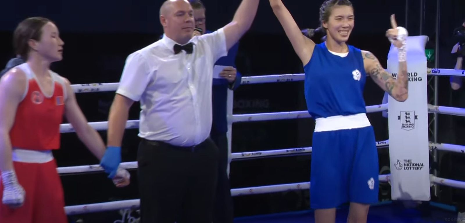 黃筱雯(藍位角)擊敗蒙古好手奪下金牌。(翻攝自 WORLD BOXING YouTube)世界拳總年終賽在英國舉行,黃筱雯第一局拿下3個10分,以3比2占有領先優勢;第二局激戰後,黃筱雯打成4比1,第三局結束後公布成績,最終裁判舉起黃筱雯的手宣告勝利,她在第三局以壓倒性的5比0勝出,最終比數為4比1,收下金牌。