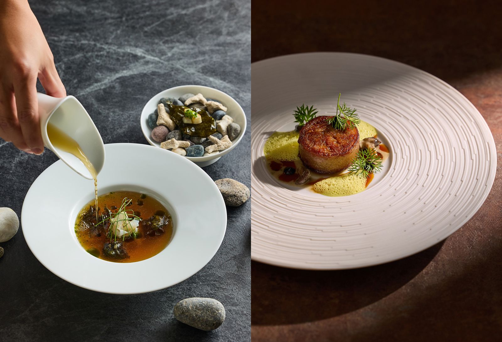 「海魚/聖米歇爾淡菜/落葵/海藻」使用台灣季節海魚與法國聖米歇爾淡菜搭配,盤底鋪上煙燻培根與皇宮菜,淋上以淡菜汁、魚高湯、海藻跟番紅花製成的橙黃透亮醬汁,厚實黏滑口感豐富這道充滿海味的魚肉料理。(午、晚間套餐菜色1,880元起/人)「黑毛豬尾/綜合蕈菇/法國黃酒/黑蒜」選用產量稀少的台灣黑毛豬尾,以香料醃漬2天後慢火燉煮軟化膠質,再以大火香煎達到表皮焦香、內裡軟嫩的化口質地,上桌前以薑黃和法國黃酒製成的醬汁點綴。(晚間套餐菜色2,980元起/人)來自法國侏羅產區(Jura)的黃酒(Vin Jaune),是以當地古老的原生白葡萄品種Savagnin釀造,帶有杏桃乾、堅果、太妃糖香氣,蘊含與中式菜餚相稱的醬香。「海—海魚/聖米歇爾淡菜/落葵/海藻」使用台灣季節海魚與法國聖米歇爾淡菜搭配,盤底鋪上煙燻培根與皇宮菜,淋上以淡菜汁、魚高湯、海藻跟番紅花製成的橙黃透亮醬汁,厚實黏滑口感豐富這道充滿海味的魚肉料理。「軟化—黑毛豬尾/綜合蕈菇/法國黃酒/黑蒜」的精髓在於豬尾的軟嫩與多種蕈菇的香氣。慢燉的黑毛豬尾入口即化,搭配香氣濃郁的法國黃酒和黑蒜,厚重又迷人香氣令人回味再三。