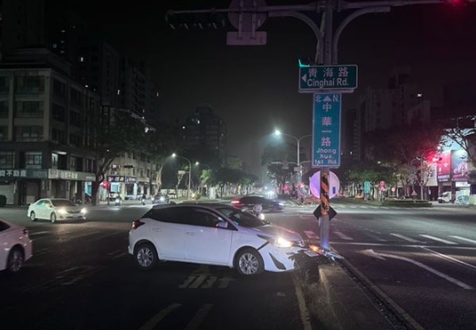 這場荒謬離奇的事故發生於今日凌晨2時,這輛白色自小客車由中華一路北向南行駛,途經青海路口時,因不明原因撞上分隔島,導致車頭嚴重毀壞。