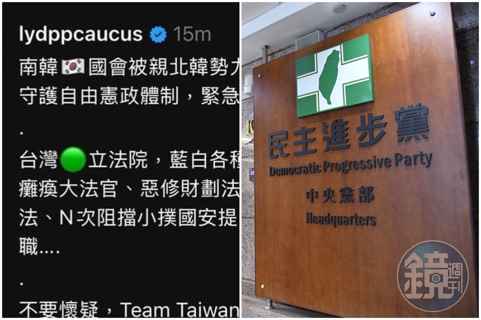 針對韓國總統尹錫悅緊急發布戒嚴,民進黨團官方也在Threads社群上發文表態附和,被各界痛批借題發揮,甚至引發外媒報導,登上國際媒體版面。針對爭議延燒,民進黨團仍未發文致歉,聲稱外界杯弓蛇影的影射與過度喧染,「實則大可不必」,要求在野黨適可而止。