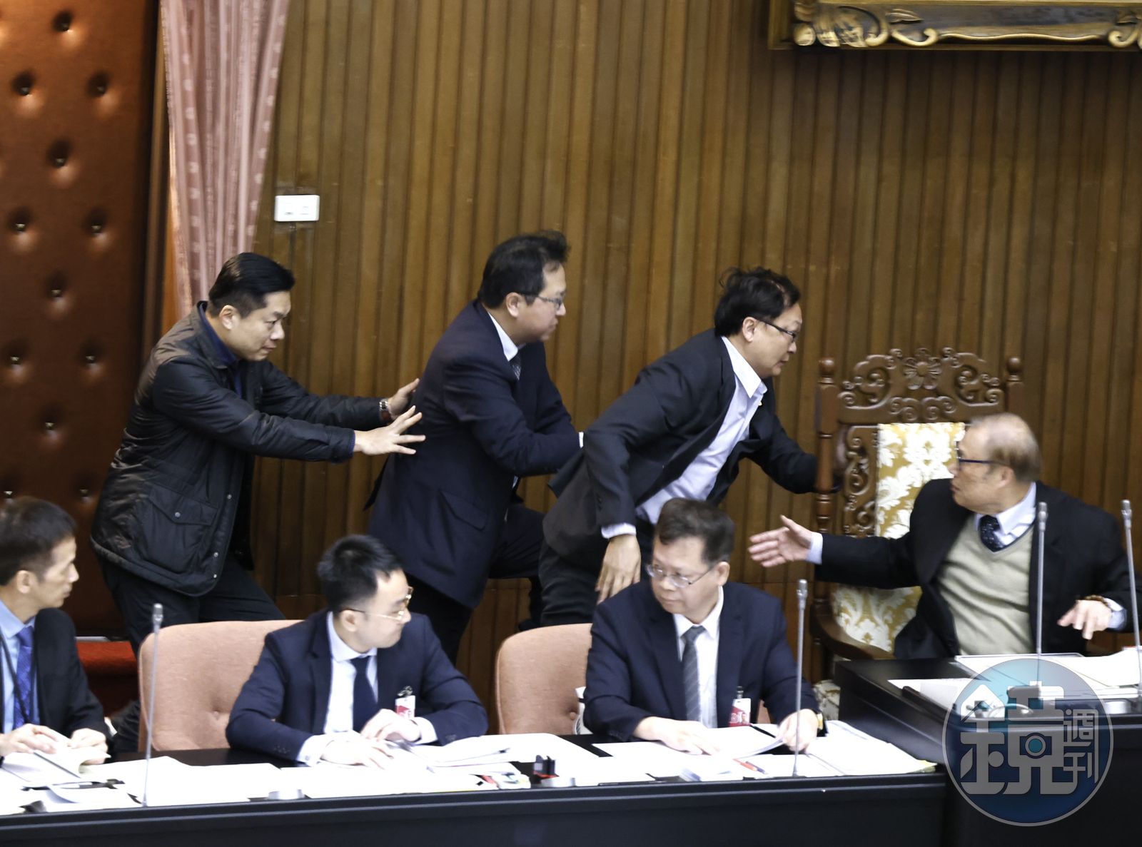 在綠委反突襲成功後,藍委眼見情況不妙,也隨即衝向主席台,在藍委人數優勢下奪回主席台,不過藍綠立委也多次爆發推擠,也在主席台兩側不斷發生零星衝突及叫囂,過程中,綠委王美惠的手遭抓傷、藍委陳玉珍衣服則被扯開。