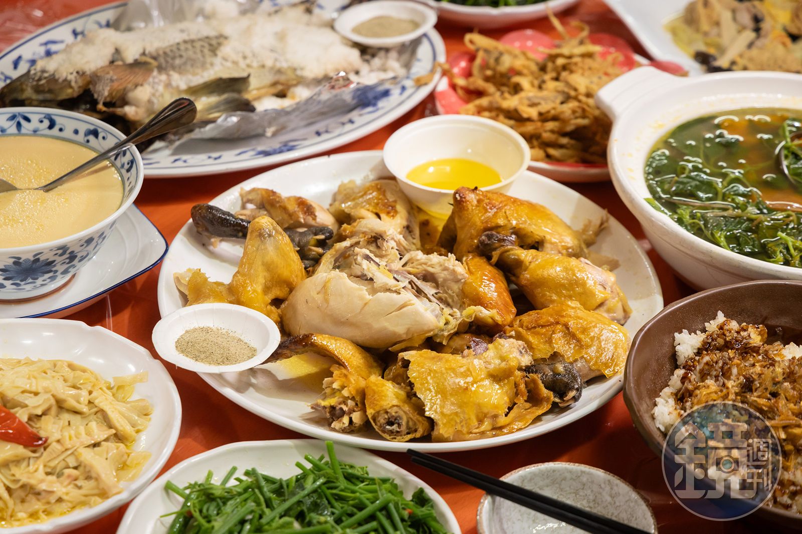 淋上雞油與油蔥酥的「雞油飯」(前,150元/鍋)與「蒸蛋」(左後,250元/份)都是餐廳的招牌菜。鯉魚潭放山雞的「桶仔雞」烤得外酥內嫩,是許多遊客造訪鯉魚潭必吃的菜餚。(時價,圖中約850元/隻)「南瓜野菜湯」和「蒸蛋」則將放山雞的鮮美滋味發揮到極致,尤其是用土雞蛋和雞高湯製成的蒸蛋,滑嫩細緻,拌著雞油飯一起入口,更能品嘗雞湯、雞油與白飯交融的絕妙美味。