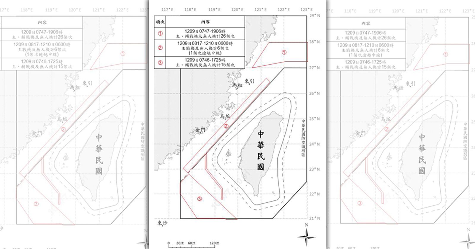 國防部指出,根據最新動態,中共軍機持續以主、輔戰機及無人機形式侵擾台灣周邊空域。其中,自9日上午至晚間,26架次共機在台灣北方空域活動,最接近距離東引東北方僅約30浬;另有6架次共機在台海中線活動,1架次更進一步進入西南空域。此外,15架次共機自9日上午至10日清晨進入台灣西南空域,範圍延伸至防空識別區邊緣。