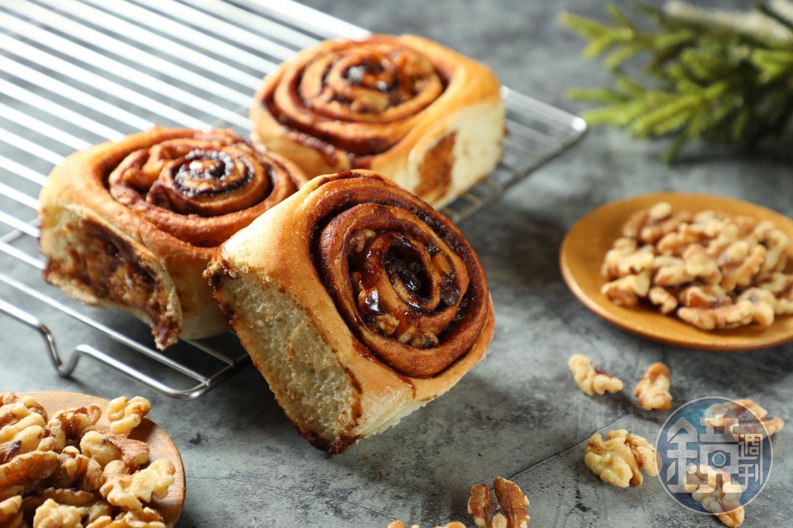 「法式核桃」「經典原味」「綜合莓果」等眾多品項中,我最喜歡「香烤蘋果」,特地選用由日本引進、紐西蘭栽種的富士蘋果,高脆度的特點,讓果肉經過烘烤後不容易變得軟爛,微微酸甜的果丁口感,巧妙中和了肉桂捲內餡的甜膩感。肉桂控可以直接升級加濃版本「勁濃經典原味肉桂捲」,除了包裹在麵糰裡的肉桂粉,還會再額外附上一包肉桂醬,可以淋在上面一起享用。