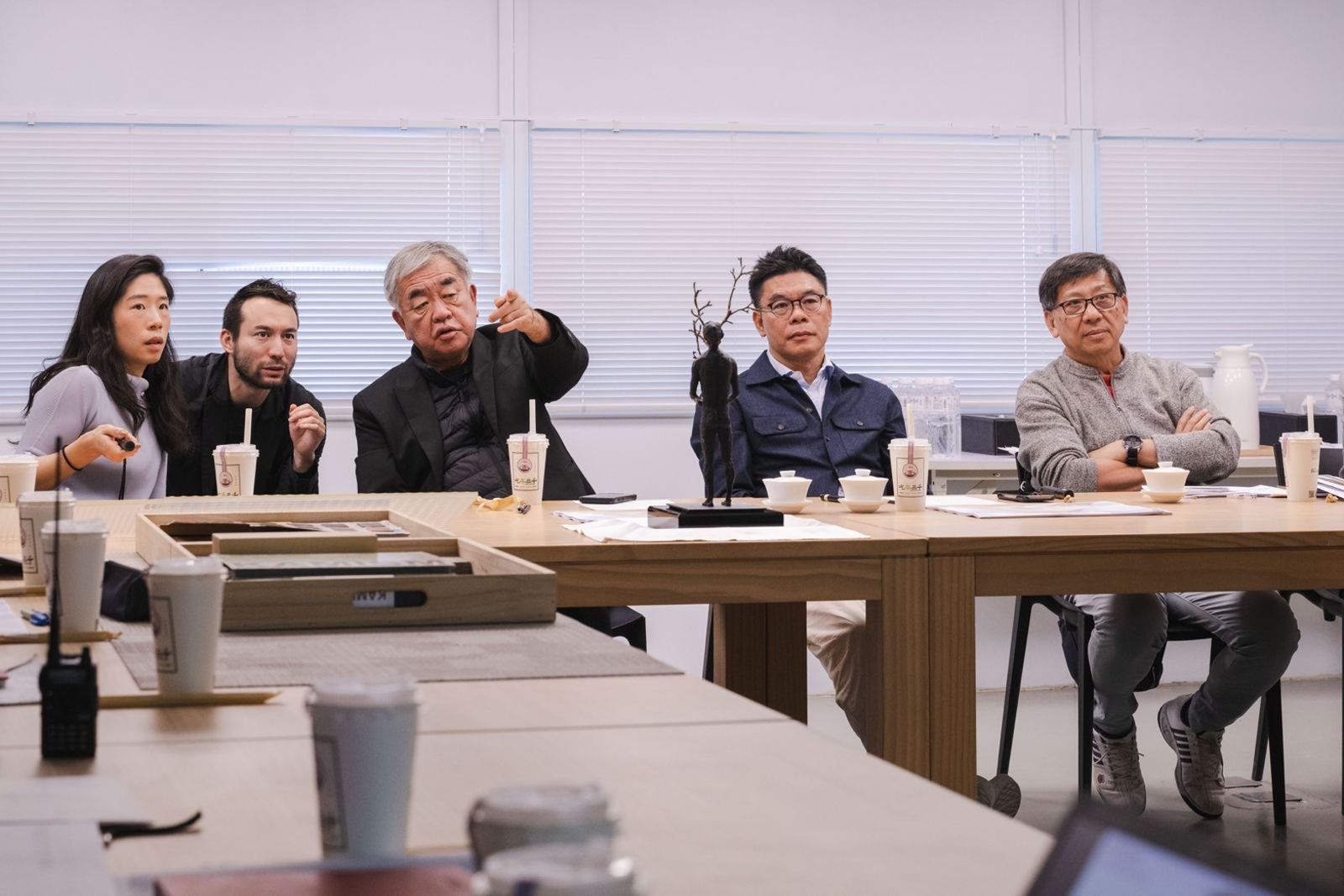 隈研吾此行來台,與江韋侖及團隊進行專案會議,深入討論建築規劃細節與設計進度,包含主建築前方的四層樓複合式空間,屋頂增設新設計,規劃於露台區增加座位,延續木結構的語彙,讓參訪者有更好的休憩體驗,以及各空間建築材料,美觀、耐用性、使用者體驗,等多面向的探討,透過密集的會議討論與實地現勘,扎實檢視每一個設計規劃與工程環節。