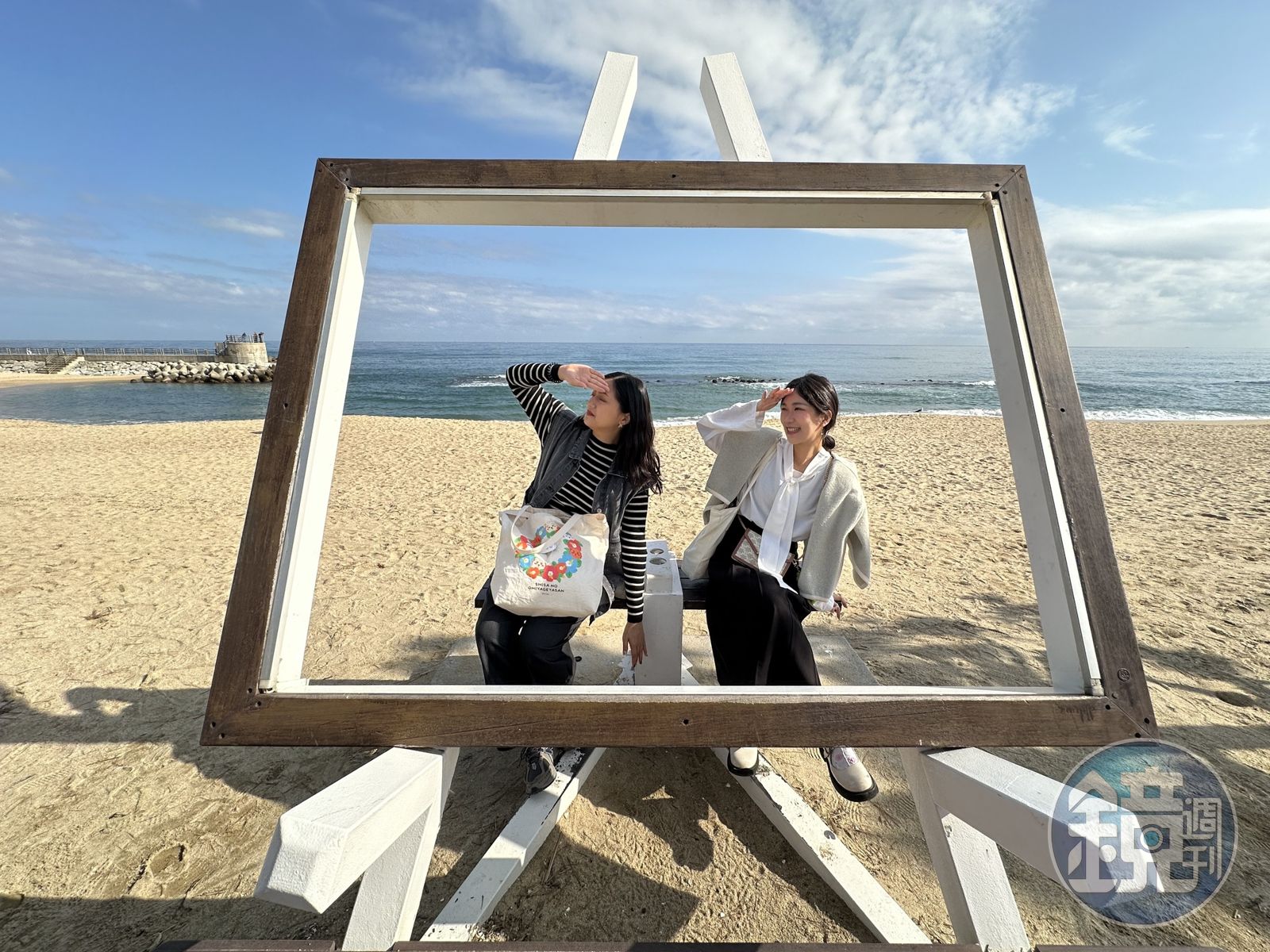 從最開始的湖景,沿途行走抵達當地地標、佇立在河海交界的「江門立木橋」,接著是同時擁有海岸景致和松林的江門海邊,隨著海岸線漫步,愜意無比。愛耍浪漫氛圍的韓國人,在綿延的沙灘上擺出各種能擺拍的裝置藝術,也讓我與同行友人拍得不亦樂乎,徒步旅程豐富有趣了起來。