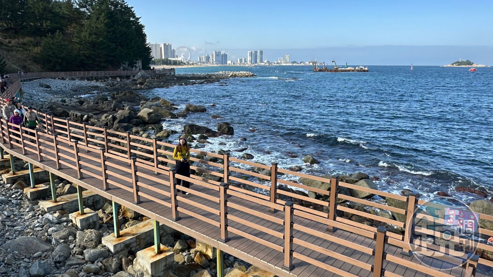 經過熱鬧的碼頭港口區域後,迎來的是「大海香氣路」。這條1.74公里長的特色海岸步道,是老少咸宜的海上木棧道,同樣又是「海景第一排」絕佳散步路線,也是韓國人喜愛前來觀光的路段,之前更因為韓劇《男朋友》前來拍攝取景,吸引許多年輕人前來約會,或拍照打卡。沿途走起來輕鬆寫意,在我徒步的當日,剛好是週六,許多人攜家帶眷,人潮相當多。
