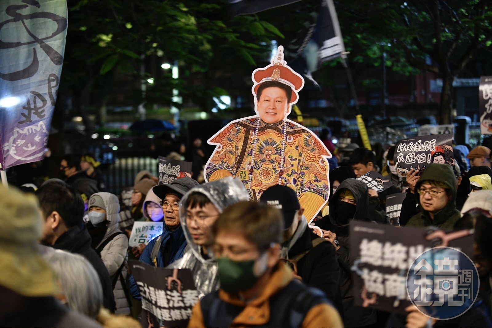 民團連日舉辦集會抗議,昨晚先是來到國民黨中央黨部抗議,今晚則是頂著寒風來到立法院外,提出5大訴求,包含要國民黨立院總召傅崐萁下台,還有回復國會合議制民主秩序、要求在野黨退回3大惡法。