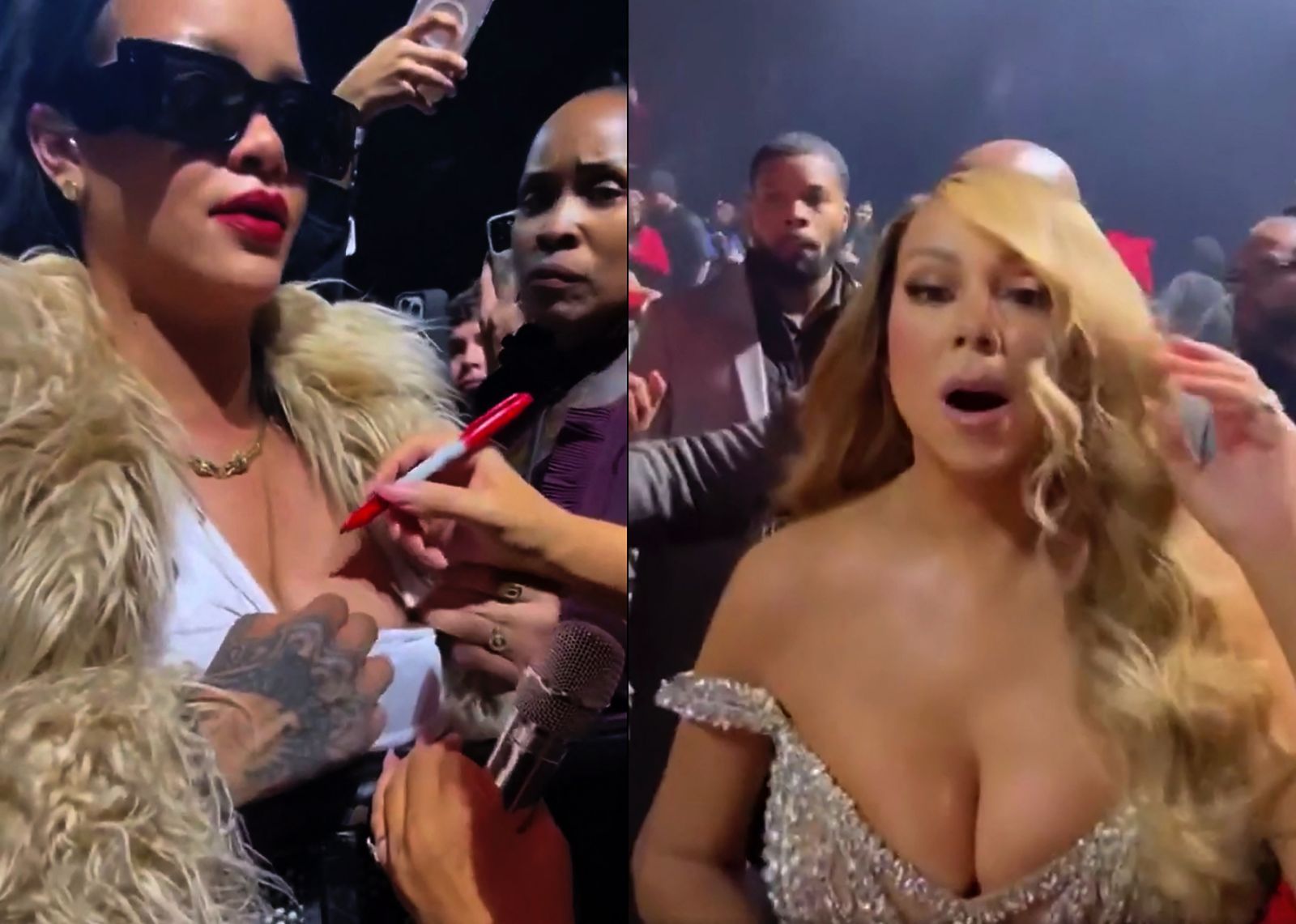但戴著墨鏡跟身穿白色皮草的蕾哈娜隨即開口,表示已經想好了橋段,問誰有簽名筆?瑪麗亞凱莉說:「我們有筆。該去哪買妳的唇膏?我們該去哪下單?」最好笑的是,瑪麗亞一看到觀眾席上大家都拿手機出來拍,還嬌嗔:「我這邊的角度不好看!」蕾哈娜反問:「不然要拍哪邊比較好看?」還強調是她男人的點子,要瑪麗亞凱莉幫她簽名,簽在胸部上,還不忘記把上衣的衣領拉低、一把搶過麥克風,跟大家炫耀,她有一個瑪麗亞凱莉簽名的胸部,「這真是超屌的!」