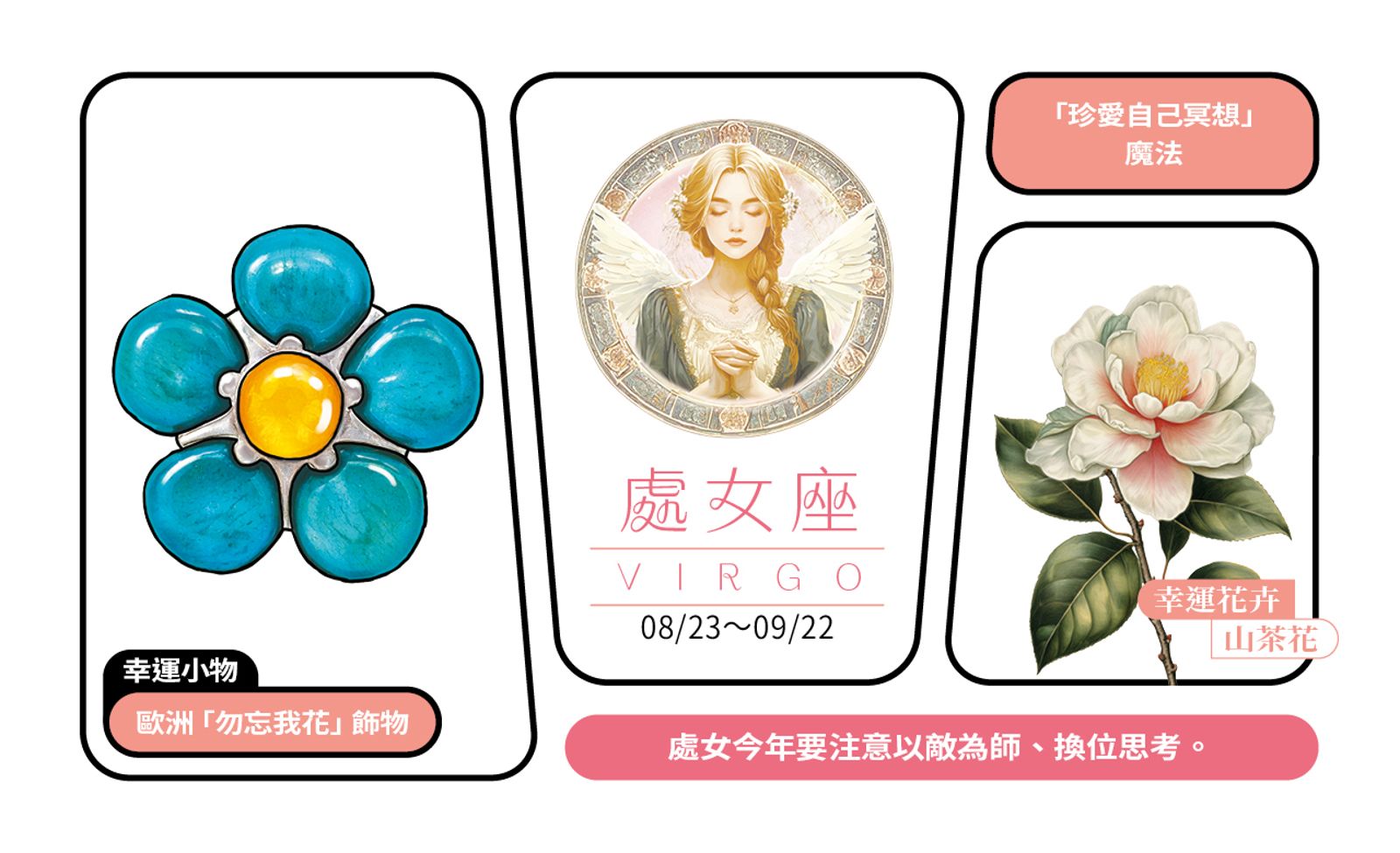 藍色勿忘我是處女座的誕生花,常被用來表達愛意、友誼、忠誠與互許承諾。由於傳說具有抵禦黑魔法邪惡能量的效力,所以也是避邪擋災、趨吉避凶的吉祥物。能為佩戴者辨認真愛、斬斷惡緣。
