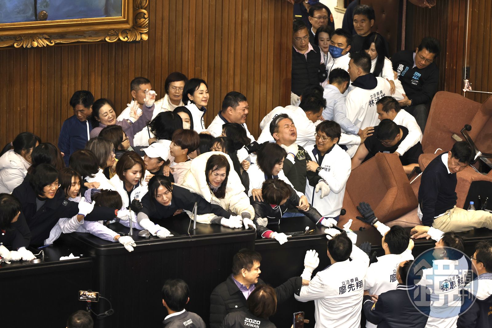藍白立委以人數優勢成功將民進黨立委拖出,搶回主席台,眾人高喊「開會!開會」同時藍營男立委則以人牆堵住,不讓綠委進入,以利召開院會審議修正案。