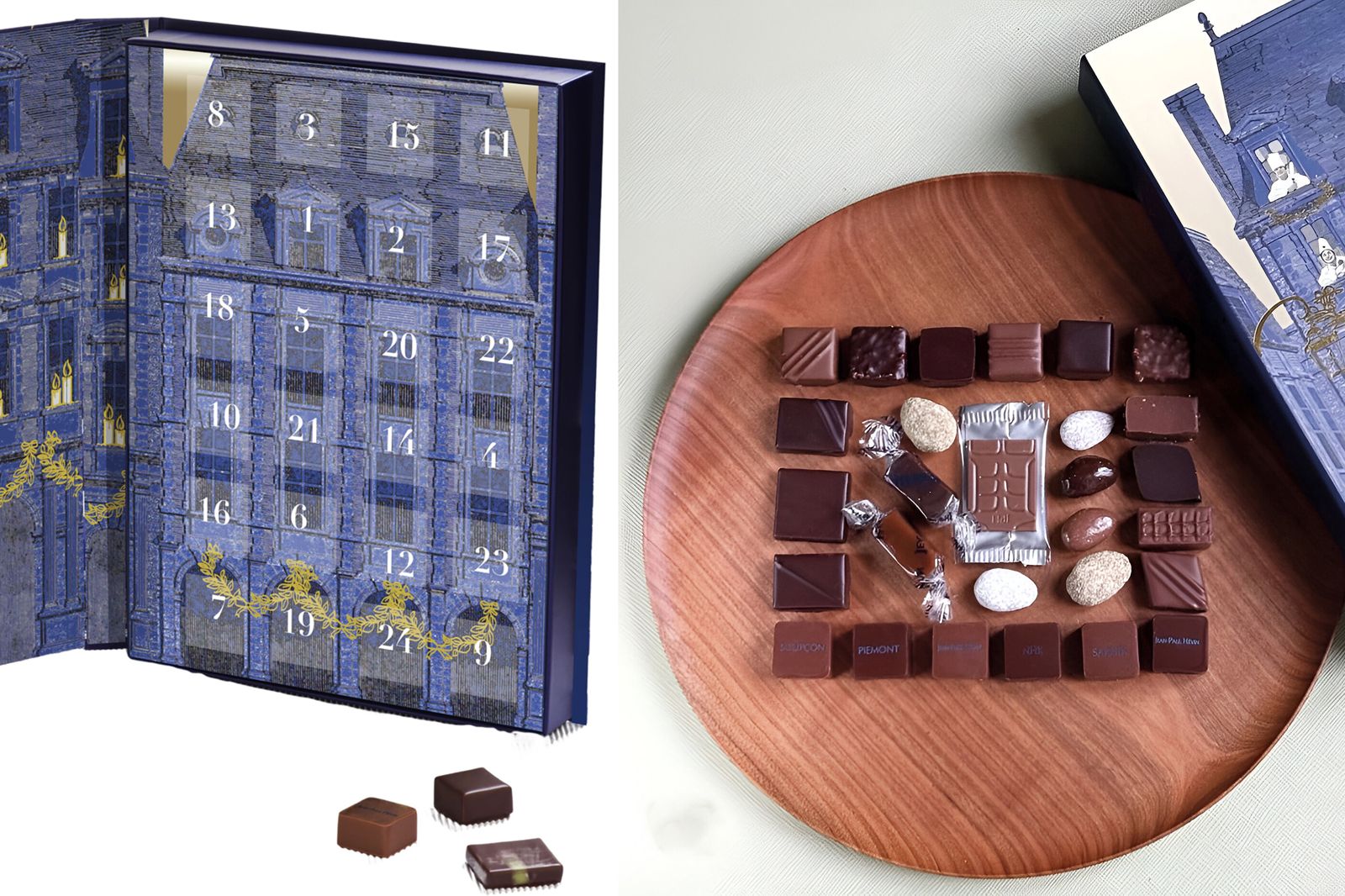 今年的耶誕節Jean-Paul Hévin將巴黎的建築之美融入經典的耶誕倒數月曆中。禮盒外觀以皇家藍為主色調,精緻描繪奧斯曼建築的法式風情,閃耀的松枝葉和金色緞帶,為禮盒增添濃厚的節日氛圍。打開禮盒,內盒設計以燦金燭火映襯著法國十大最美廣場之一的白萊果廣場,廣場中央的路易十四雕像象徵著他對法國時尚和可可文化的貢獻。
