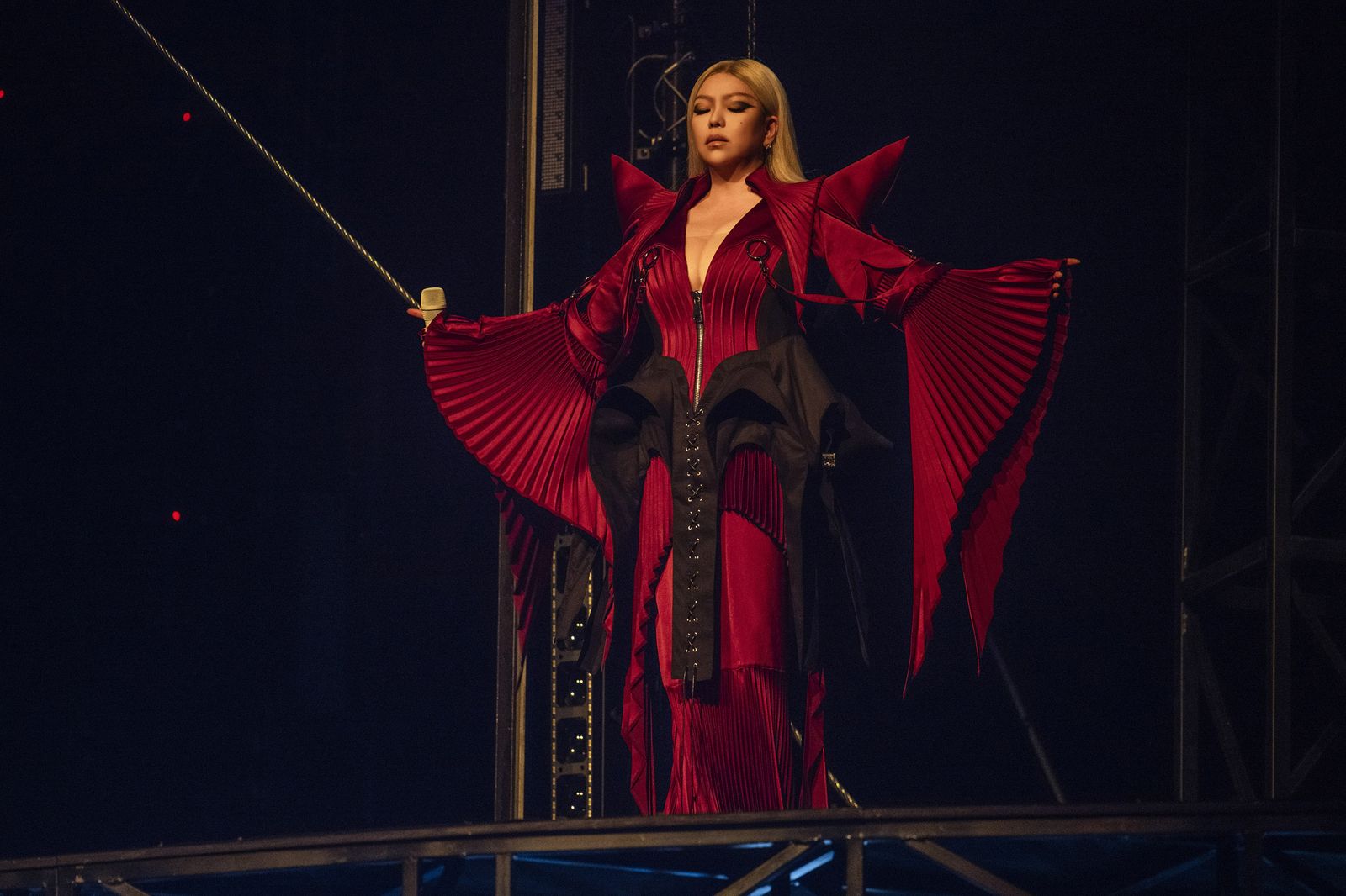 首度破大巨蛋,aMEI成為大巨蛋票房吸金最高的人,連唱5場共有20萬張票完售,,總票房進帳超過8億元,她說:「我覺得今天,我必須HOLD住我的情緒,前兩天沒有睡好,因為又興奮又緊張,想了很多事,但是,今天要上台之前,台上、幕後的工作人員圍在一起,我就覺得要心安了。」aMEI忘情在台上演唱,情緒高張演唱〈血腥愛情故事〉,還隨旋律大跳M字腿,性感又迷人,隨即逗趣說:「第一場有點太嗨,後面還有四場,我冷靜一下,電風扇開大一點。」