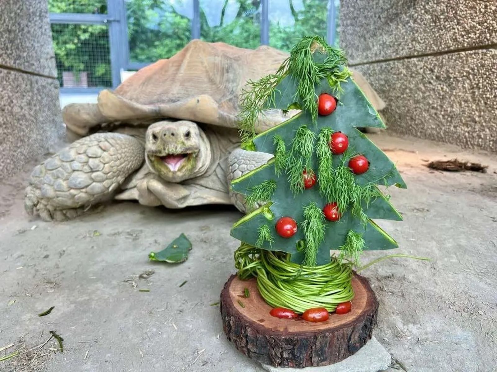 蘇卡達象龜則津津有味地品嚐以仙人掌切成樹狀,再用小番茄點綴而成的迷你耶誕樹。(壽山動物園提供)發布時間:2024.12.23 12:29 臺北時間