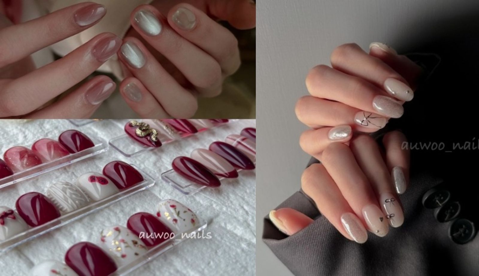 黑色線條蝴蝶結搭配貓眼及鑽點綴,不會太少女,還帶著知性的女人味。(instagram @auwoo_nails)銀色金屬蝴蝶結搭配通透感霧白以及冰藍底色,浪漫又優雅。(instagram @zi0nail)想嘗試但平常又不敢做太招搖浮誇的風格嗎?春節正好可以把這種顧慮的煩惱拋諸腦後啦!新年就是要做應景的開運吸睛喜氣紅,趁著過年給的勇氣,把指尖裝扮得閃閃動人吧!