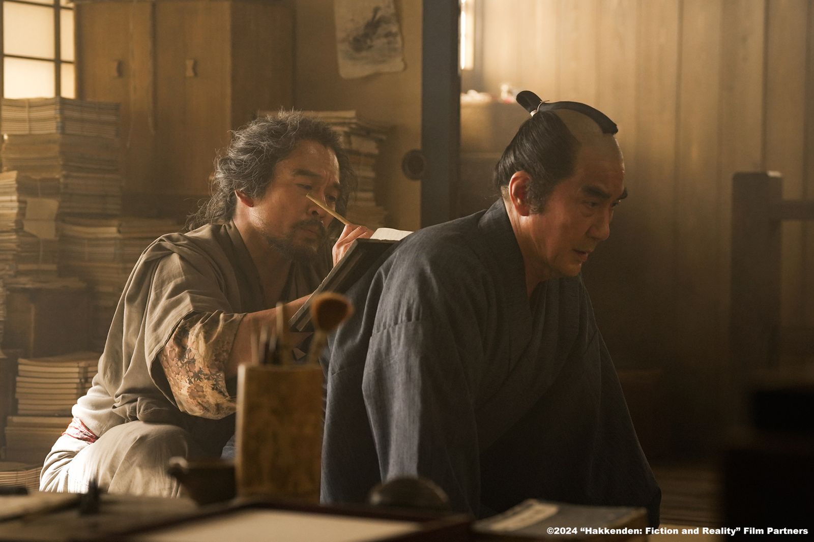 役所廣司(右)與內野聖陽在《八犬傳》多在書房內對話討論創作,兩人的表演功力令導演曾利文彥也大嘆「沒有我插嘴的餘地」。(原創娛樂提供)發布時間:2025.01.02 05:28 臺北時間