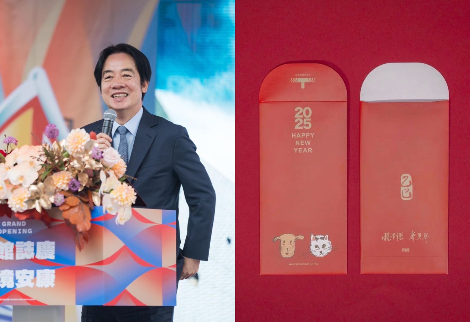 賴清德昨在臉書分享新年的總統府春聯、紅包袋,寫道:「這是我和美琴畫的狗和貓,祝福大家『六順和春』!」