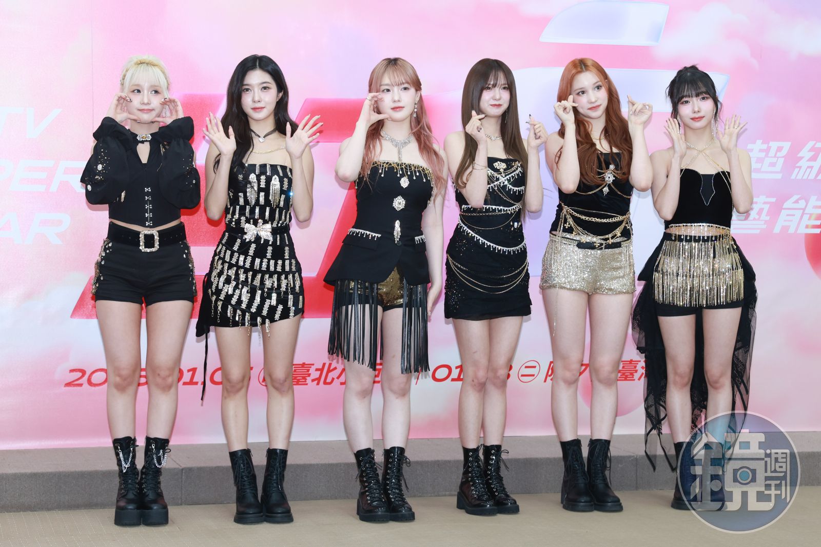 韓國女團Kep1er今出席《2025超級巨星紅白藝能大賞》記者會。成員(左起)江崎光、金多娟、金采炫、隊長崔有真、休寧巴伊葉與徐永恩。