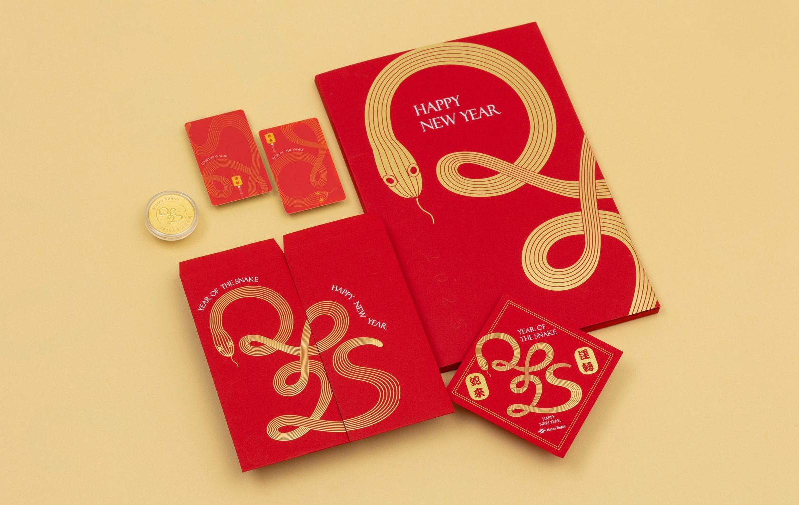 車票以鮮紅色為主調,搭配霧金色蛇形圖案與蛇來運轉字樣,營造濃厚的年節氣氛,實用與收藏兼具。(北捷提供)紀念套票內容豐富,包含一日票2張、蛇年紀念金幣1枚、2款特製紅包袋及春聯1幅。設計主題圍繞「蛇來運轉」,結合「蛇」與「捷運」蜿蜒流暢的形象與2025年字樣,象徵新的一年無懼挑戰,時(蛇)來運轉,步步順遂。