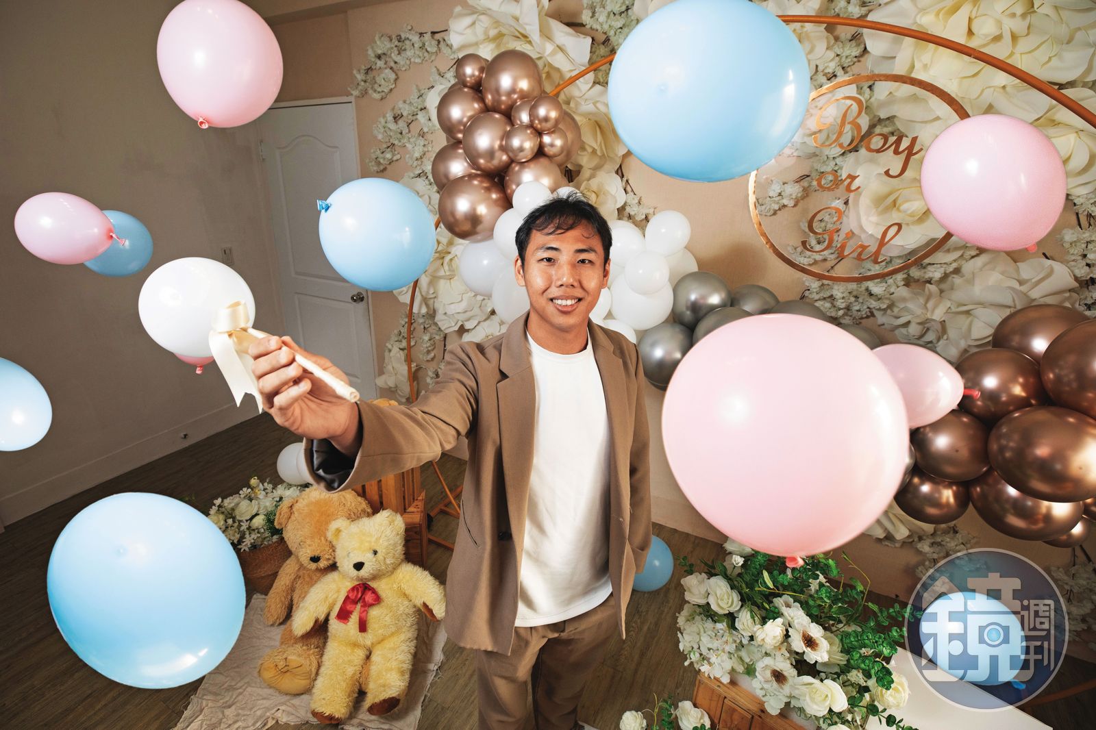 33歲的李彥儒很有創意,「現在最常見的揭曉方式是戳破氣球,看裡面飄出什麼顏色的小氣球就知道性別,我們還請過一藍一紅的舞龍舞獅,或做火山爆發,看噴煙是紅煙還是藍煙。」他原是自創工作室的婚紗攝影師,能投入提供快樂的派對行業,大概是因為無可救藥的樂觀,才會歷經疫情賠錢後,依然堅持創業路,「因為我有興趣,覺得蠻好玩的,而且我不太喜歡輸的感覺。」