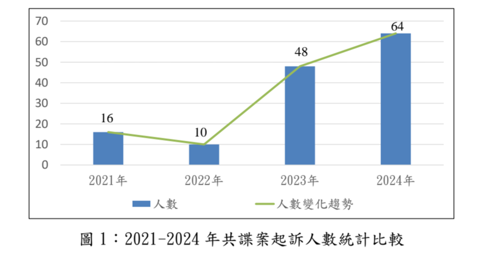 在滲透目標部分,近年共諜案起訴人數明顯上升,其中2023年48人,2024年64人,較2021年、2022年呈高倍數成長;起訴共諜案件亦從2021年3件、2022年5件攀升至2023年14件、2024年15件。另中共鎖定目標則以現、退役軍人佔比最高,2024年涉案遭起訴退役軍人15人佔23%,現役軍人28人佔43%,顯示現、退役軍人已成為中共對台滲透之針對性對象。