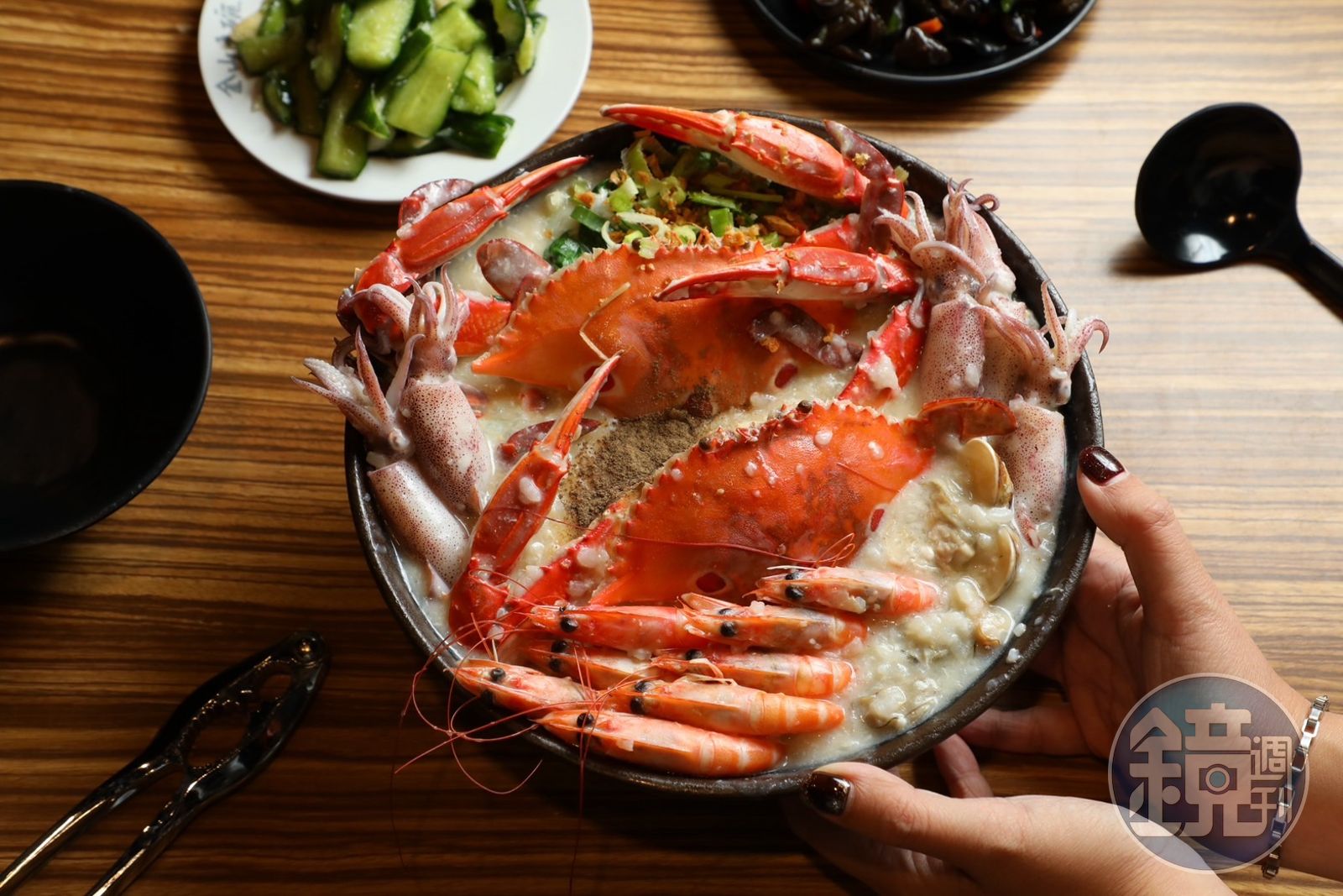 雅葳說:「三點蟹來自北海岸,肉質細緻、海味鮮甜,加上我們特別用雞高湯和花蓮的御皇米熬粥,整體香氣會更明顯。」「海鮮粥」雖是單人份,但也同樣被各種好料鋪滿整個碗面,彷彿在看海鮮圖鑑,只能說金山大碗真是太佛心
