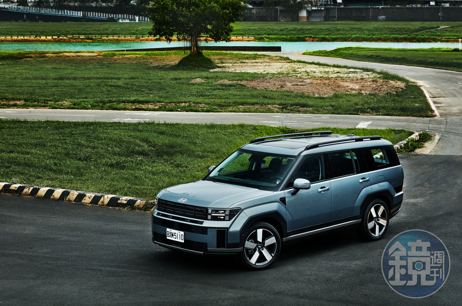 如果上一代 Santa Fe 還帶著些許柔和,那麼新一代的方正硬朗設計則徹底改變了風格。車頭的大面積水箱護罩搭配 H 型 LED 日行燈,無論白天還是夜晚都令人過目不忘;尾部 H 型尾燈組則進一步提升科技感與辨識度。車側線條簡潔有力,配上 20 吋五輻低風阻鋁圈,既流線又富肌肉感。橋式行李架更為喜愛戶外活動的家庭提供了更多可能。不過,尾部設計對部分消費者來說可能過於剛硬,少了一點柔和的元素。此外,僅提供白色、藍色與銅色三種外觀選擇,對於追求個性化的買家來說稍嫌不足。
