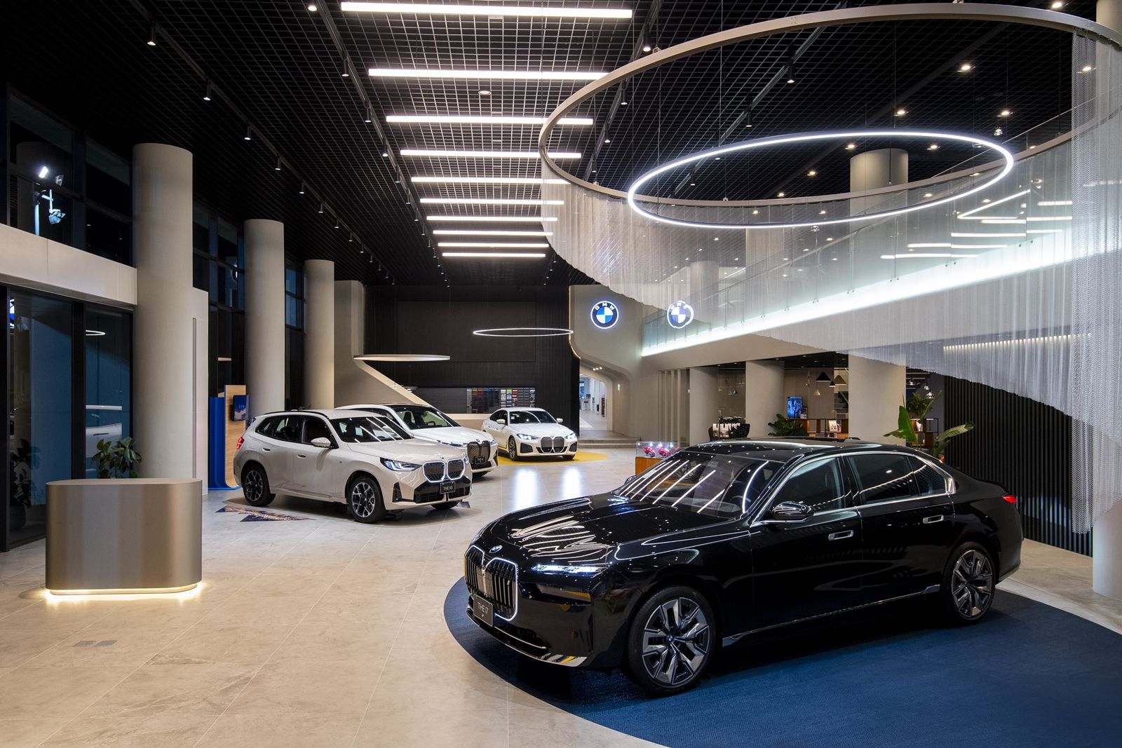踏入BMW 彰化昌一,首當其衝的是那種一進門便能感受到的空間張力。Retail.Next展間打破了傳統的展示框架,將車輛與空間的關係重新定義。不再是典型的車展空間,沒有那種鋼筋水泥的冷硬感,反而是一個現代與藝術交織的場所。燈光不再是單純的照明工具,而是設計的一部分,像一個高明的指揮家,指引著顧客的目光在每輛車上停留。天花板和牆面用深色調打造出一種舒適的包覆感,而懸浮的燈具像藝術品一樣懸掛在空中,映照著那些以最完美角度擺放的車輛。這裡的每一處設計,無論是流線型的動線還是獨特的家具,都在不知不覺中告訴你,這是一個專為品味而生的空間。