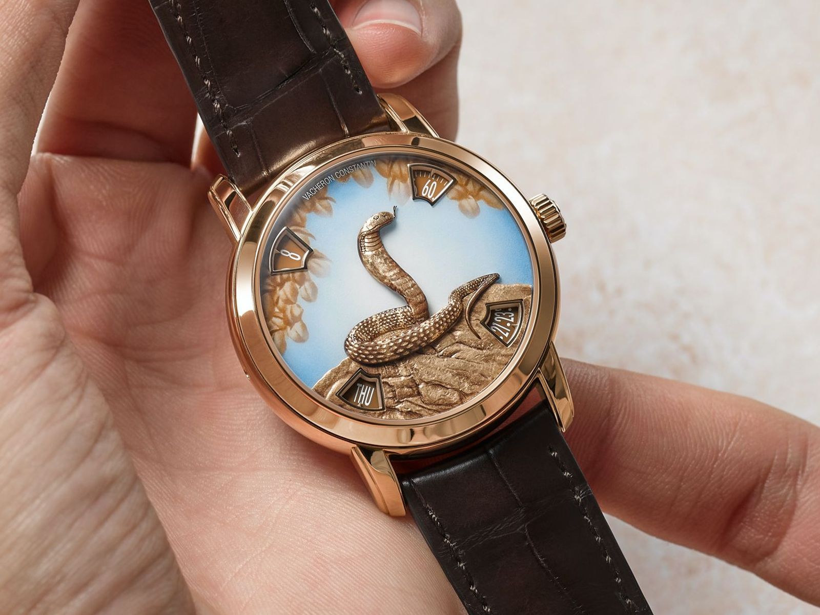 全新「藝術大師」生肖系列蛇年錶款,錶盤的正中央一條以手工雕刻的眼鏡蛇,盤坐在岩石之上,呈現出王者般的氣勢。蛇身與岩石,都是以 18K金所打造,工匠必須先雕刻出形體與紋理之後,再塗漆以增強視覺效果,光是這個過程,就耗時三天。