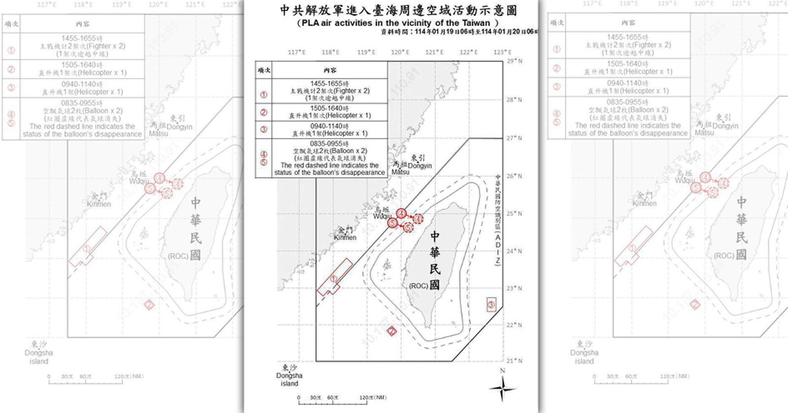 根據國防部發布的訊息,昨日上午8時35分,國軍在基隆西南方91浬處偵獲1枚空飄氣球,高度約1.8萬呎,氣球於9時3分消失。隨後在上午9時17分,又於基隆西南方119浬處發現第2枚空飄氣球,高度同樣為1.8萬呎,該氣球於9時55分消失。
