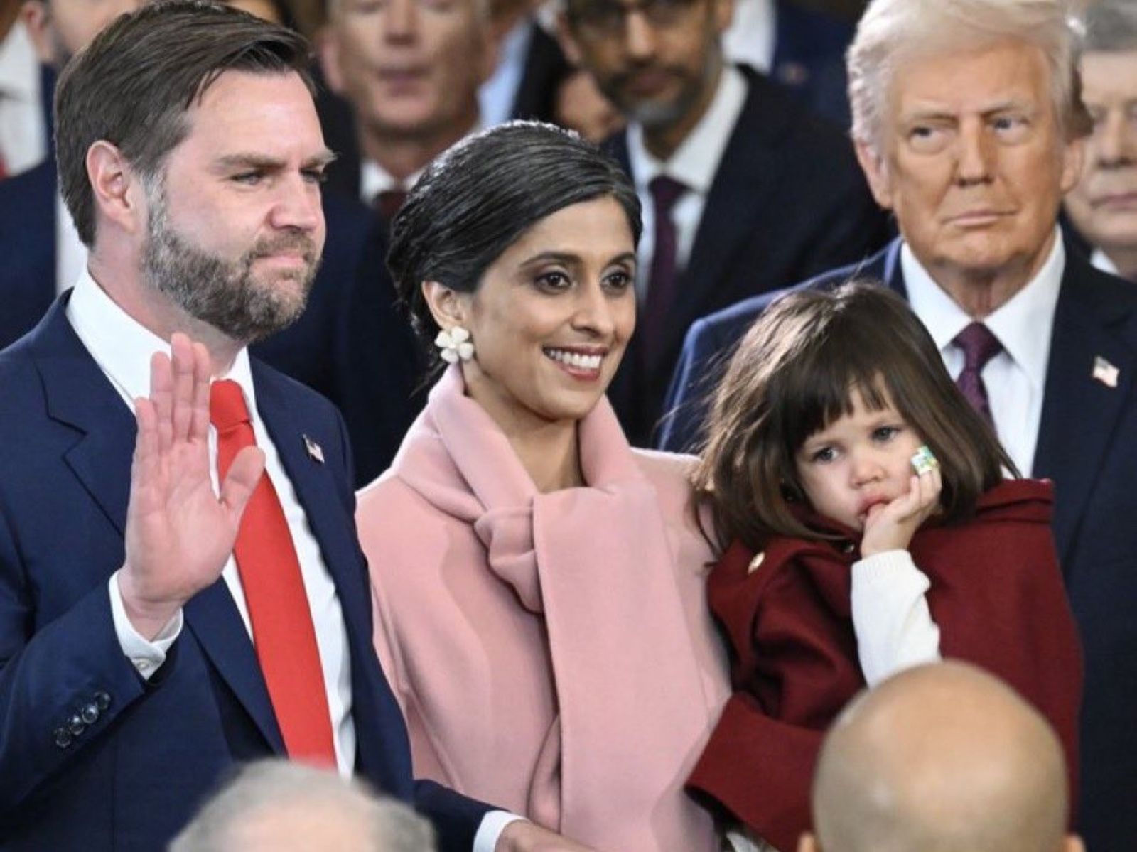 綜合外媒報導,范斯和妻子烏沙(Usha Chilukuri)育有2子1女──7歲的伊旺(Ewan)、4歲的維維克(Vivek)以及3歲的米拉貝爾(Mirabel)。范斯宣示時,妻小、母親貝芙莉艾金斯(Beverly Aikins)站在一旁,他特別選用曾祖母的家族聖經進行宣誓。當他唸著誓詞,被媽媽抱身上的米拉貝爾竟自顧自的吸著大拇指,她的另外3根手指還貼滿了五顏六色的OK蹦,完全把爸爸的鋒頭搶光,相當可愛。