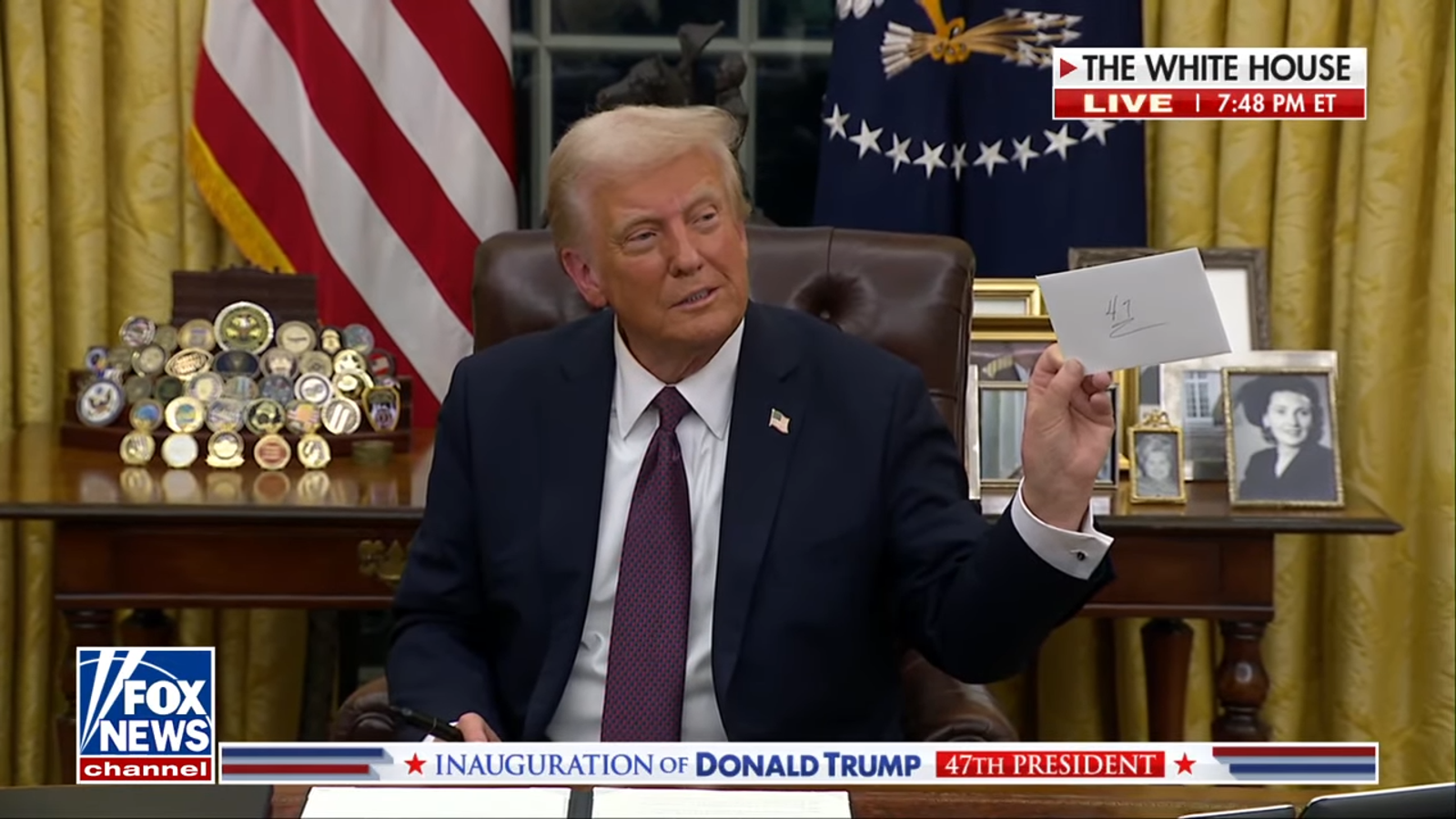 而川普在他的橢圓辦公室簽行政命令的過程中,福斯記者突然問到:「拜登總統有留信給你嗎?」川普一邊簽名一邊說:「他可能有吧」,然後停下手邊文件,「等等」,望像辦公桌下的抽屜,「他們不是會放在書桌裡嗎?我不知道」。