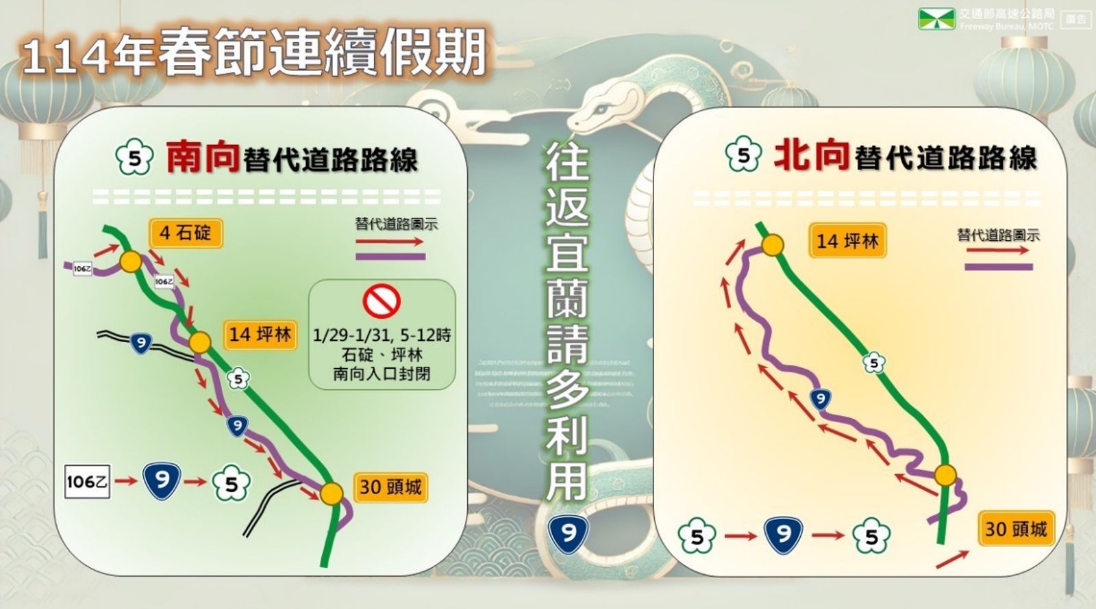 春節連假尖峰時段,國5北向頭城往坪林地區民眾,可改走台9替代道路;國5南向石碇往坪林地區民眾,可改走縣道106乙接台9替代道路以避開國5壅塞車流。高公祝大家春節假期行車平安。