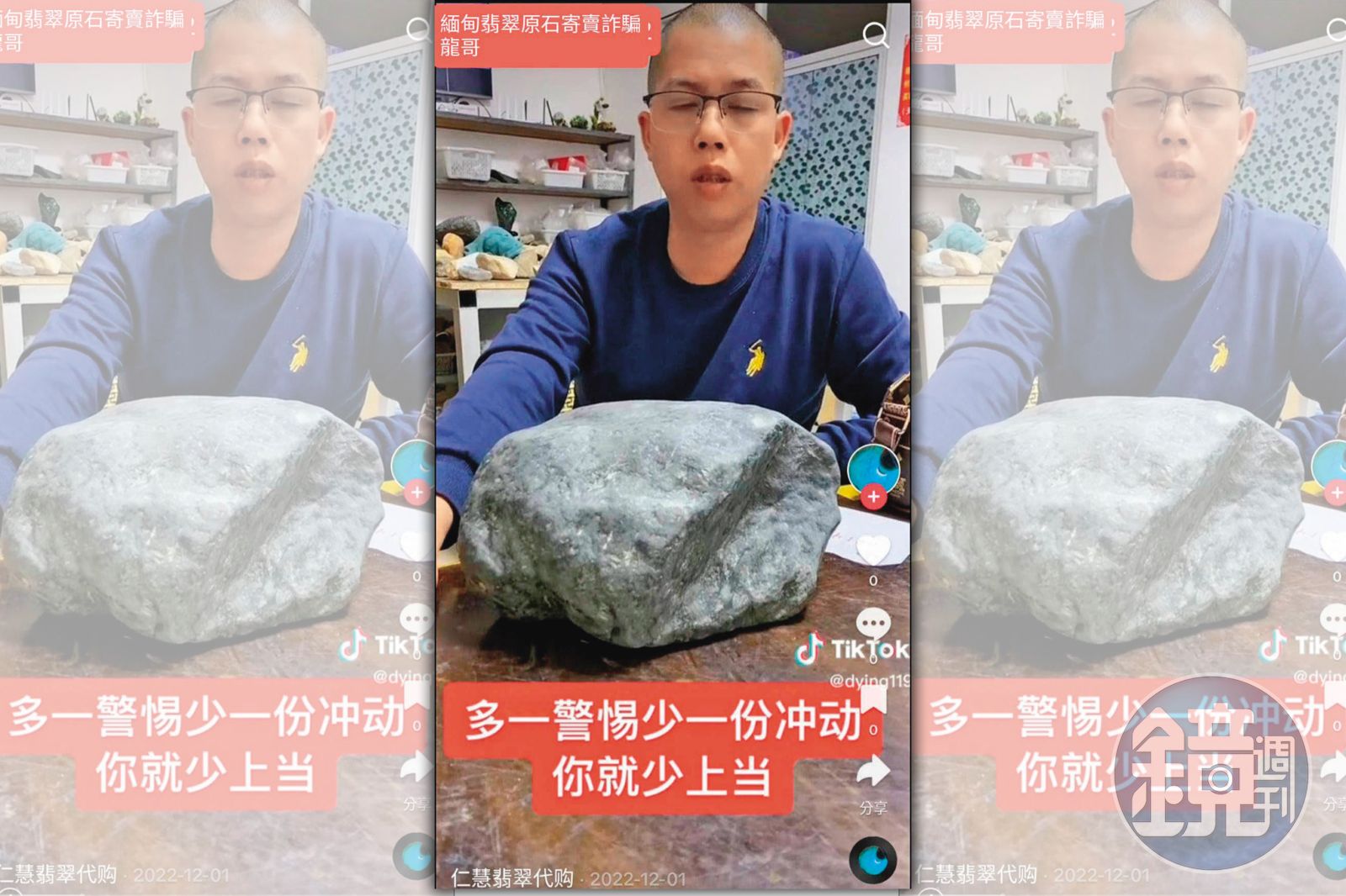 同樣被騙的B先生表示,他在抖音花十幾萬元買翡翠原石,也有匯款到蔣玉國的帳戶,結果收到的都是不值錢的廢石,還有朋友看直播主展示翡翠成品,覺得色澤美又有證書,認為可投資,花了數百萬元買下,結果收到的商品跟直播間看到的落差很大,就連證書也是假的。