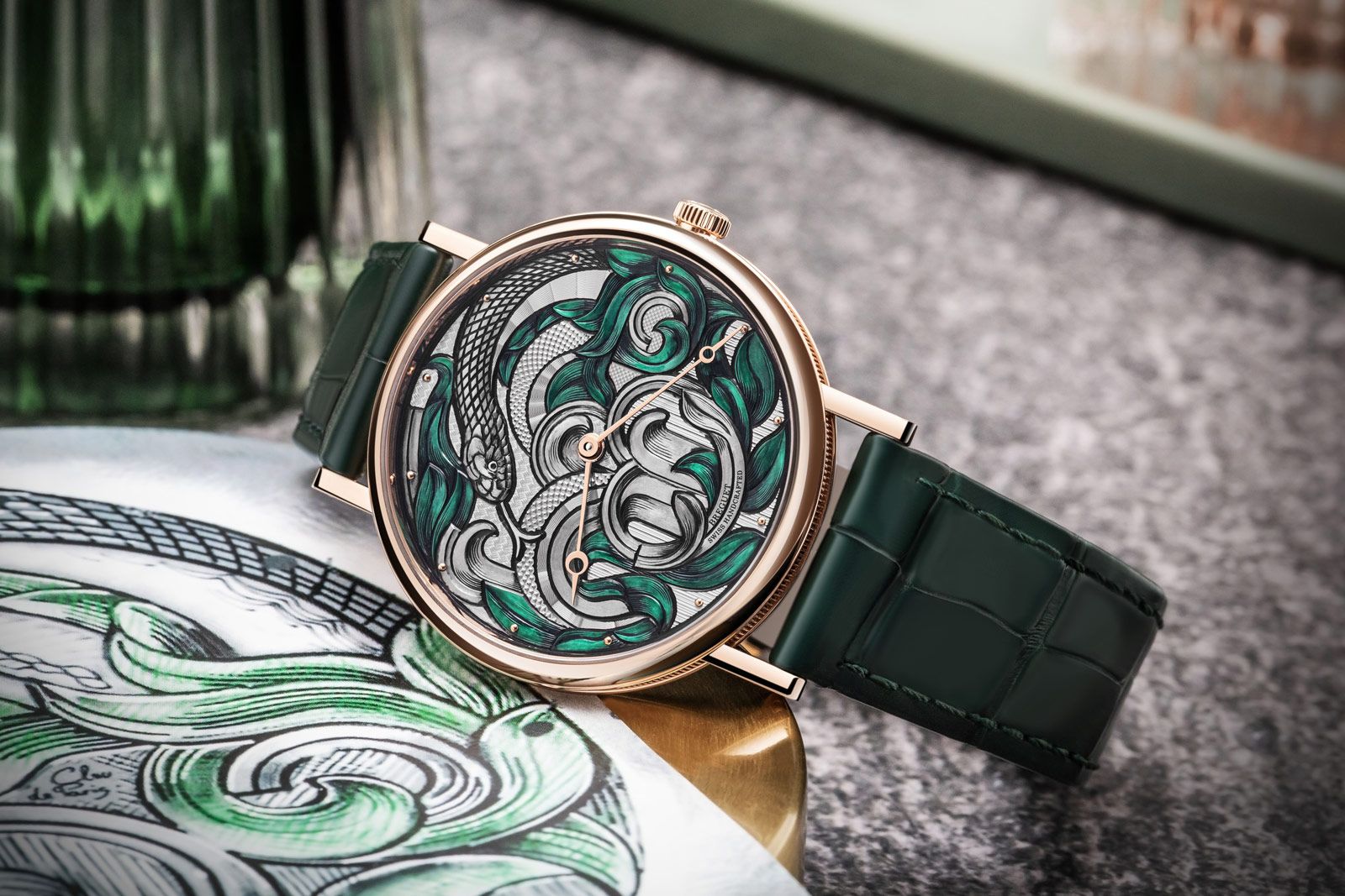 寶璣 Classique 7145 蛇年紀念腕錶,最大亮點在於面盤。其製程相當複雜,面盤上的蛇形與草叢圖案,先被勾勒出來之後,再由工匠在顯微鏡下,使用雕刻刀和鑿子,進行手工雕刻。 完成後,錶盤被進行一次清潔和拋光。 接著,工匠仔細地在特地部位加上黑漆,以營造出陰影和深度。然後進行另一次拋光之後,開始以操作機刻雕花機器,進行手工機雕。機雕的精密度達 0.1 毫米,紋路更多達五種,最後,再塗上半透明的亮漆,在草葉上呈現出綠色色調。