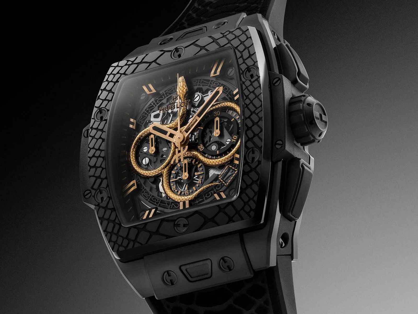 這款全新的 Spirit of Big Bang 計時碼錶「蛇年限量版」,以酒桶形計時碼錶來展現蛇年主題,除了黑色陶瓷錶圈與錶帶上的蛇紋細節,最引人注目的,是面盤上那一條微型金蛇。3D立體的金屬蛇身以雷射切割技術製作,蛇身底部附加了5根支腳,膠合嵌進藍寶石水晶製作的透明面盤上,使之呈現懸浮在機芯上方的視覺效果。另外,鏤空指針和時標,也採用相襯的金色,非常華麗。
