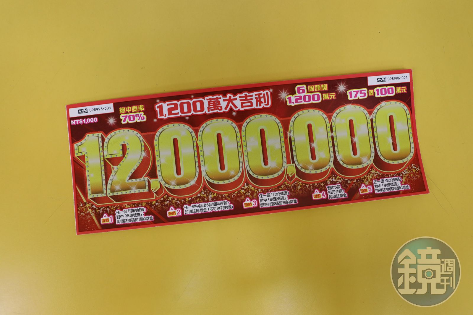 根據台灣彩券公司資料,「1200萬大吉利」刮刮樂全台共推出6個1200萬元頭獎,截至1月31日,已經刮出2張,還有4張尚未被刮中,民眾仍有機會試試手氣。