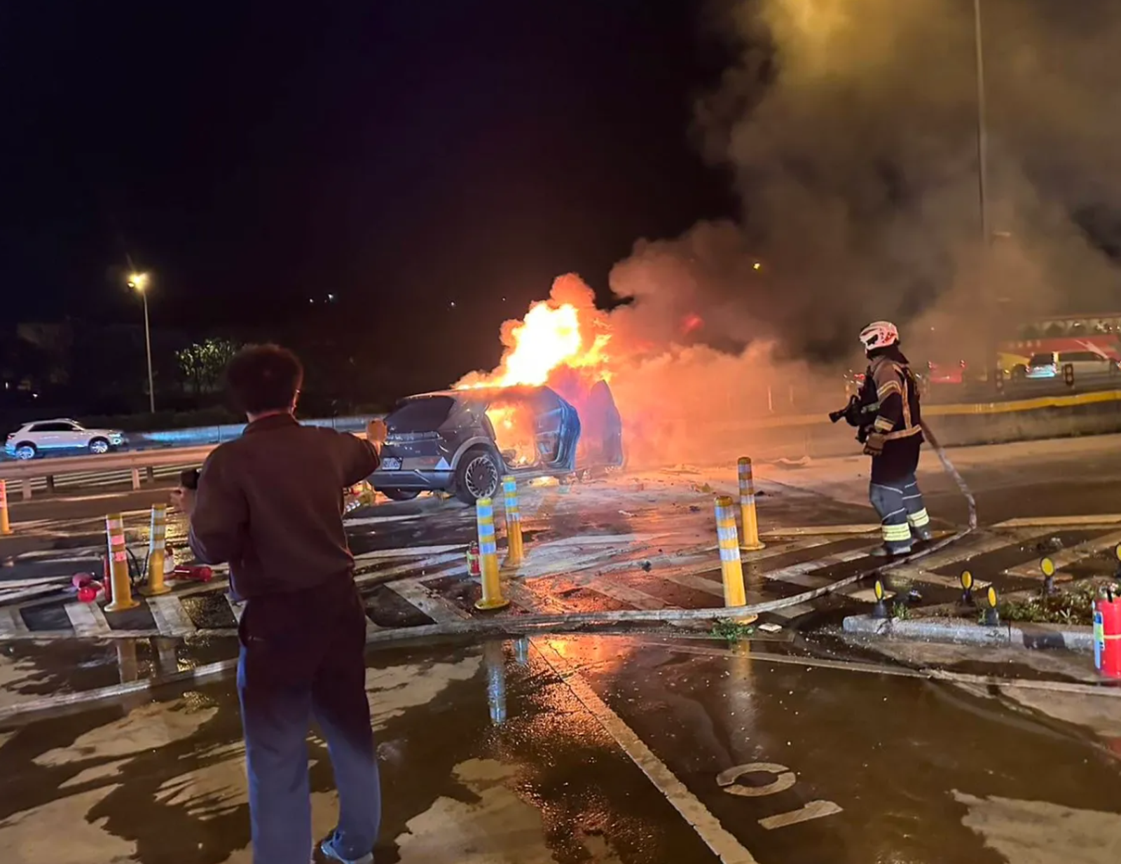 針對網路上的議論,國道警方今日表示,事故發生時,楊梅分隊的7名游姓員警聽聞撞擊聲後,立即衝出協助救援。他們拿取分隊內12支滅火器,並請求休息站商家提供滅火器,一同壓制火勢。此外,員警與現場熱心民眾合作打開車門,將後座小孩的安全帶剪斷並救出受困人員,爭取寶貴的黃金救援時間。警方強調,員警當時無畏烈焰,全力投入救援行動。